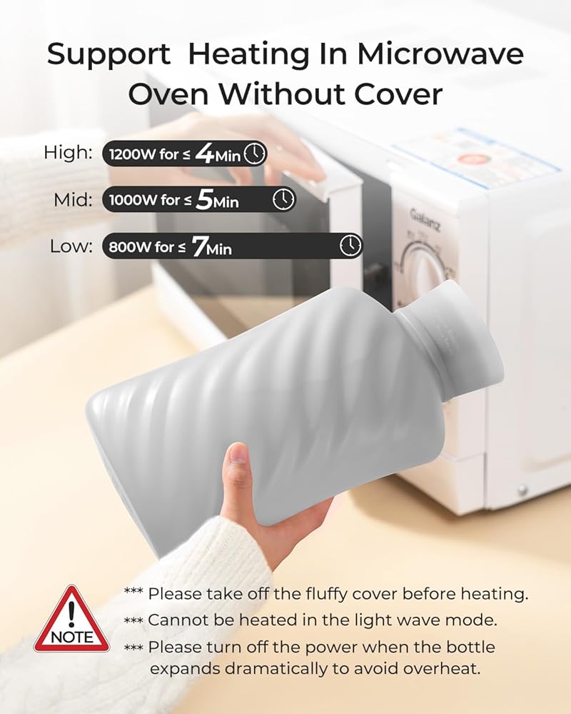 ❤️دعم التسخين في فرن الميكروويف: يمكن لزجاجة الماء الساخن القابلة للاستخدام في الميكروويف أن تتحمل درجات حرارة تصل إلى 446 درجة فهرنهايت/230 درجة مئوية، وحتى -104 درجة فهرنهايت/-40 درجة مئوية. يمكن تسخينه في فرن الميكروويف بأقل من 1200 واط لمدة تقل عن 5 دقائق. يرجى إزالة الغطاء الخارجي قبل التسخين، وإيقاف تشغيل الطاقة فورًا بمجرد أن تتوسع زجاجة الماء الساخن بشكل كبير لمنع ارتفاع درجة الحرارة.