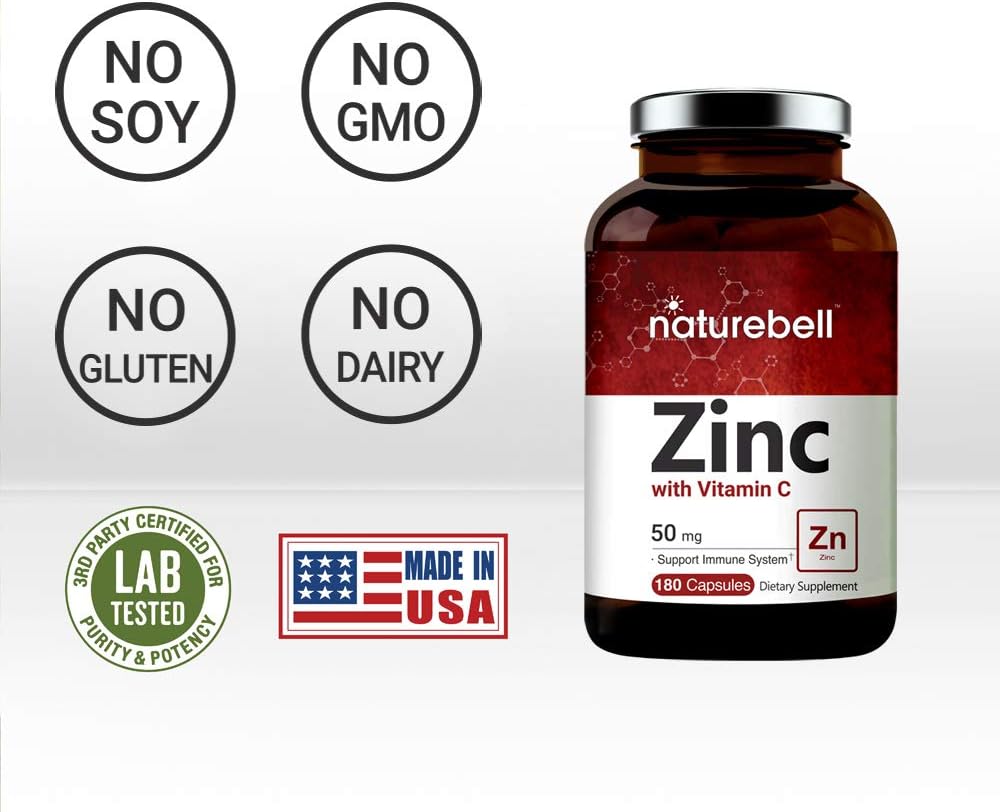 Naturebell Zinc 50mg with Vitamin C, 180 Capsules, Zinc Vitamins and Immune Vitamins, Support Immune System and Antioxidant, Non-GMO