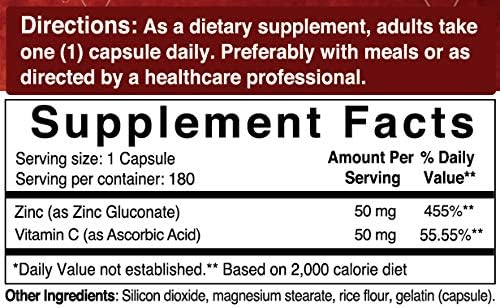 - Zinc Gluconate Supplement (Zinc Vitamin), 50mg Active Ingredient with Immune Vitamin C, 180 Capsules.