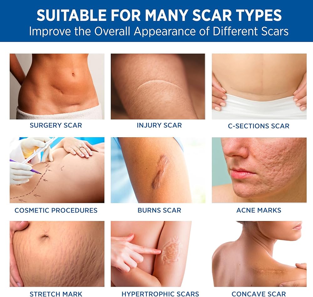 تركيبة فعالة ثلاثية المفعول: ما يميز جل السيليكون الخاص بنا هو تركيبته ثلاثية المفعول، التي تحفز إنتاج الكولاجين، وتعزز تجديد الخلايا، وتعزز لون وحجم ومظهر الندبات الجديدة والقديمة.