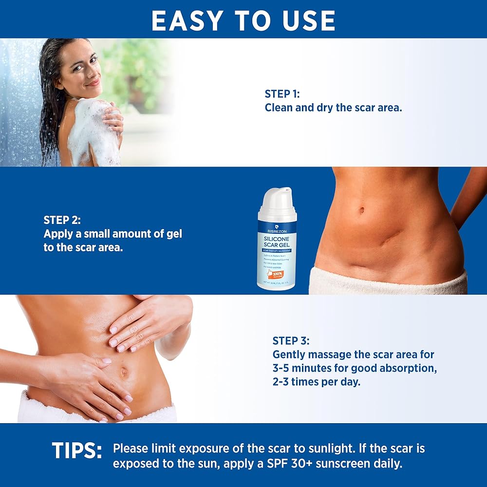 جل السيليكون المتطور للندبات: استخدام جل الندبات السيليكون الخاص بنا سهل وخالي من المتاعب، مما يضمن نتائج ممتازة. دلكي منطقة الندبة بلطف حتى تشعري بالدفء، ثم ضعي جل السيليكون للندبات واستمري في التدليك حتى يتم امتصاصه بالكامل. ضعي الكريم 2-3 مرات يوميًا، لمدة 8 أسابيع للندبات الجديدة و3-6 أشهر للندبات القديمة.