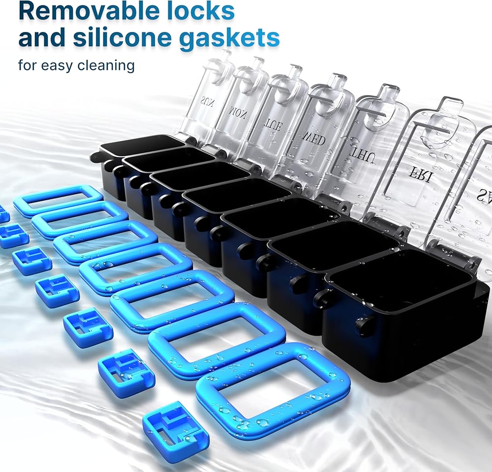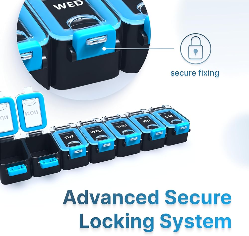 • آمنة: تحتوي حافظة حبوب الدواء على 7 مساحات تخزين لكل يوم. تحافظ الأقفال القوية للغاية المصممة حديثًا على الأغطية في مكانها، مما يمنع الفتحات العرضية، حتى في حقيبتك، مما يضمن بقاء حبوب الدواء في مكانها
