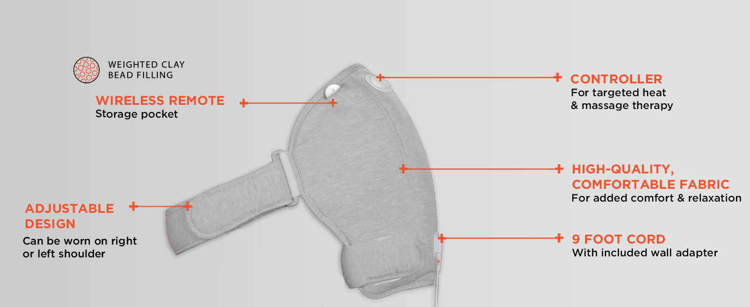 • سهل الاستخدام - يأتي غطاء الكتف مزودًا بجهاز تحكم عن بعد لاسلكي ويحتوي على جهاز تحكم عن بعد مدمج لتسهيل ضبط الإعدادات. بمجرد الانتهاء من تشغيل إعداداتك، ما عليك سوى إعادة جهاز التحكم عن بعد إلى الجيوب المدمجة. نوصي بالسماح للوسادة بالتسخين المسبق لمدة 5 دقائق لتعزيز تجربة التسخين لديك. تأكد من إضاءة زر التسخين باللون الأحمر على الإعداد العالي للتسخين المسبق.