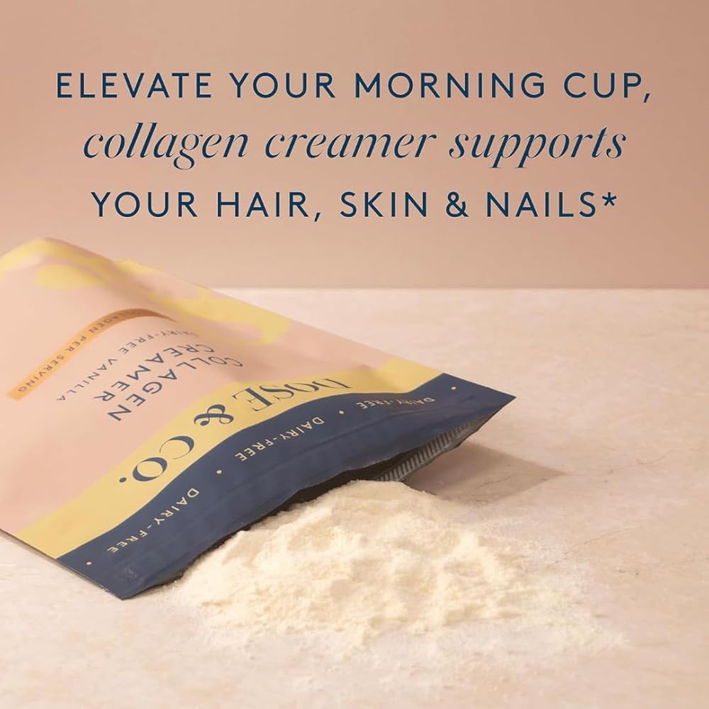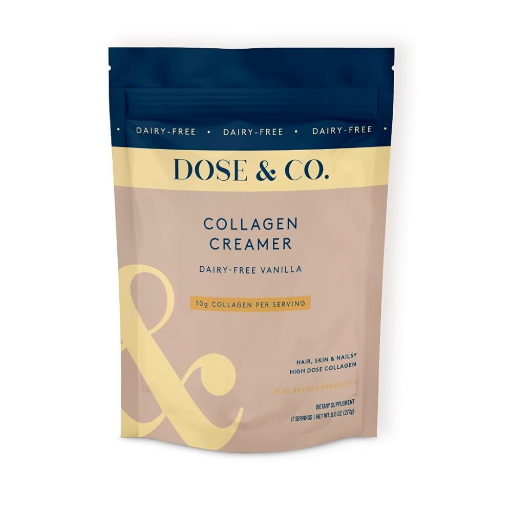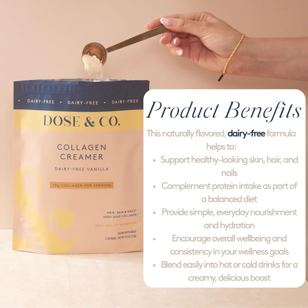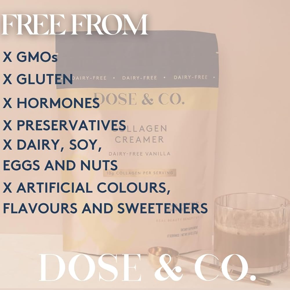 DAIRY-FREE VANILLA COLLAGEN CREAMER: Dose & Co Dairy-Free Collagen Peptide Creamer is a supportive, glow-boosting powder formula in a natural Vanilla flavor, powered by a high dose of sustainably sourced VERISOL® hydrolyzed collagen peptides. With only natural ingredients and no dairy, this premium collagen supplement is designed with optimal dissolvability and high bioavailability for science-backed, visibly noticeable results.