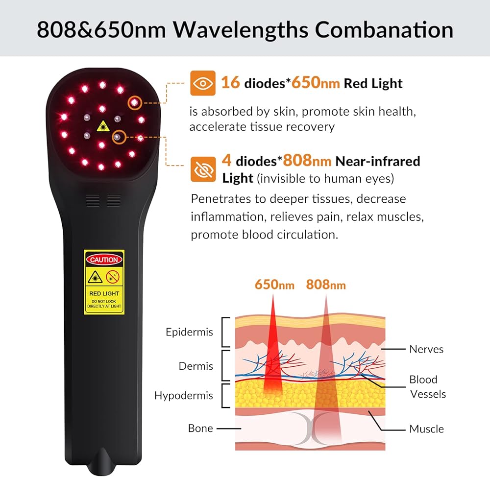 [العلاج بالأشعة تحت الحمراء للجسم] 20 قطعة من الضوء الأحمر تتكون من 4 قطعة × 808 نانومتر و16 قطعة × 650 نانومتر. يمكن امتصاص الضوء الأحمر 650 نانومتر عن طريق الجلد، مما يزيد من تدفق الدم، ومناسب للإصابات الرياضية وتخفيف الألم. يمكن أن يصل العلاج بالأشعة تحت الحمراء القريبة 808 نانومتر إلى عمق الجلد لتخفيف آلام المفاصل والعضلات. 650 و808 نانومتر هما مزيج مثالي للاستخدام لتخفيف الألم، والاستمرار في استخدام جهاز العلاج بالضوء البارد سيحقق تأثيرات أفضل. (ملاحظة: الجزء الداخلي 4x808 نانومتر غير مرئي للعين عند العمل.)