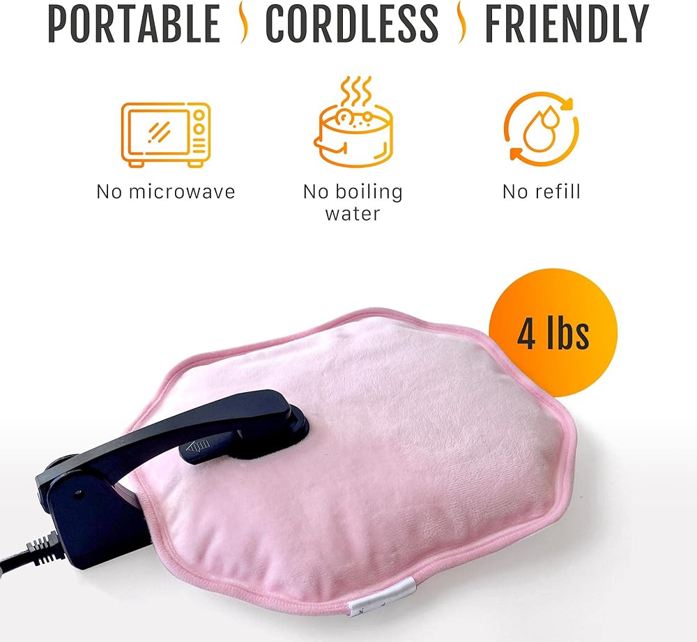 No boiling water, no microwave or no refill; Just plug in for 12-15 minutes; Water is presealed in the pocket; Its technology heats the sealed water from 140° to 158°F (60º to 70ºC); Built-in auto shut-off system prevents overheating
