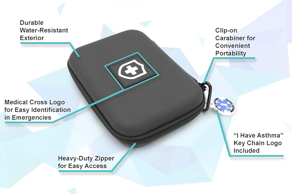 حافظة جهاز الاستنشاق مثالية للسفر، تتضمن صليب طبي على الجزء الخارجي، وحلقة تعليق بمشبك وسلسلة مفاتيح للإسعافات الأولية "I Have ASTHMA". يمكن استخدام حلقة التثبيت بمشبك للتثبيت على الشنط وتتضمن أيضًا علامة الربو من أجل السلامة.