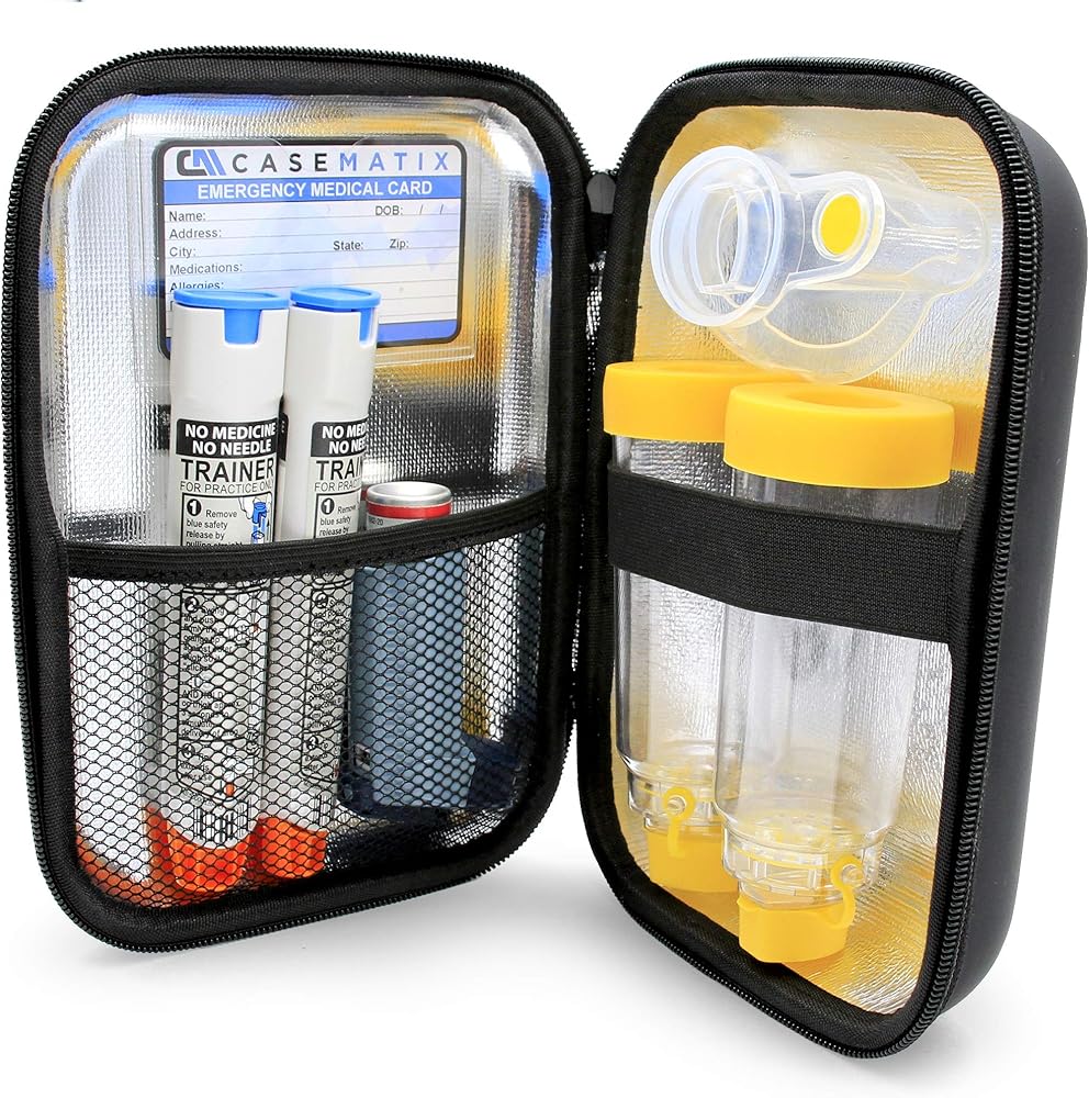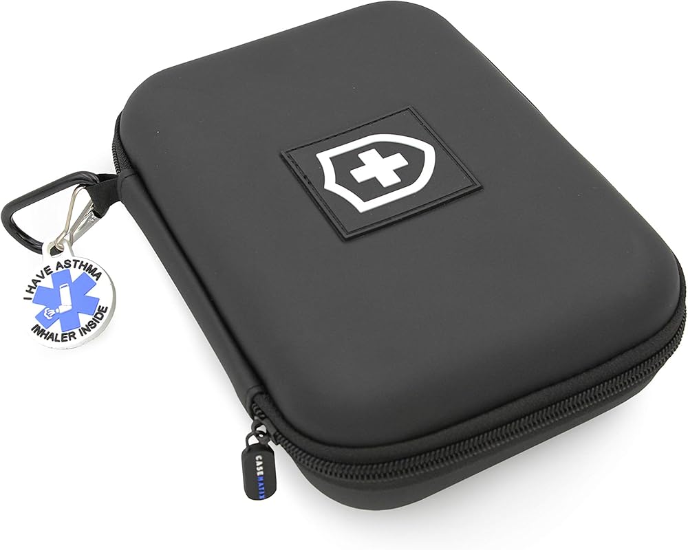 حقيبة سفر واقية لجهاز الاستنشاق والربو - حقيبة سفر للأدوية تناسب أجهزة الاستنشاق والأدوية والإيبيبينز والفواصل والأقنعة وأكثر من ذلك. تتضمن بطاقة سلسلة مفاتيح طبية "I HAVE ASTHMA" وبطاقة طبية وحلقة تعليق