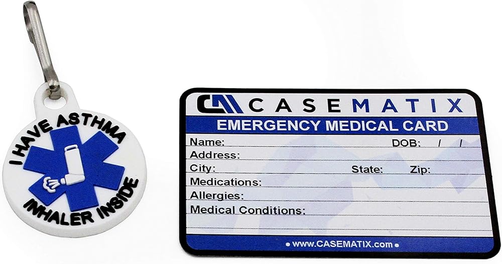 مثالية للسفر، تتضمن صليب طبي على الجزء الخارجي، وحلقة تعليق بمشبك وسلسلة مفاتيح بعبارة "I Have ASTHMA"