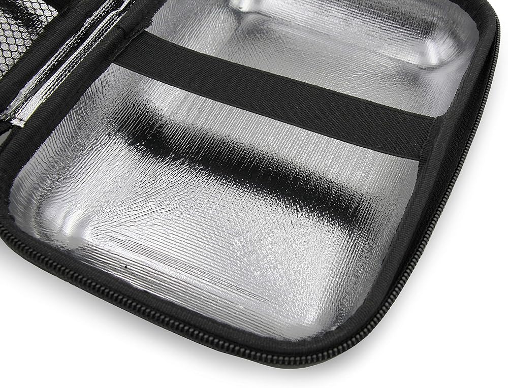 الجزء الخارجي من هذه الحافظة مصنوع من مادة ايفا الصلبة المتينة والجزء الداخلي مبطن برقائق مايلر المعزولة. يناسب بأمان مجموعة متنوعة من ملحقات أجهزة الاستنشاق والمعدات الطبية.