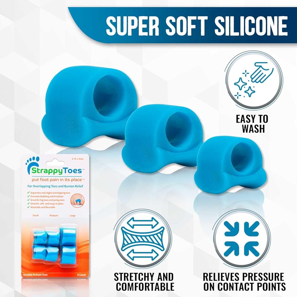 StrappyToes - فواصل أصابع القدم من السيليكون للنساء والرجال - تساعد على تصحيح أصابع القدم الملتوية والمتداخلة - مصحح الورم لتحسين صحة القدم - فواصل وأداة تمليس إصبع القدم الكبيرة