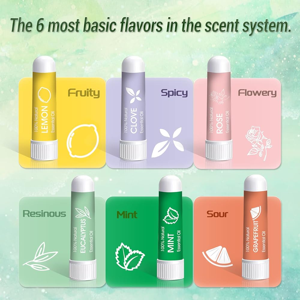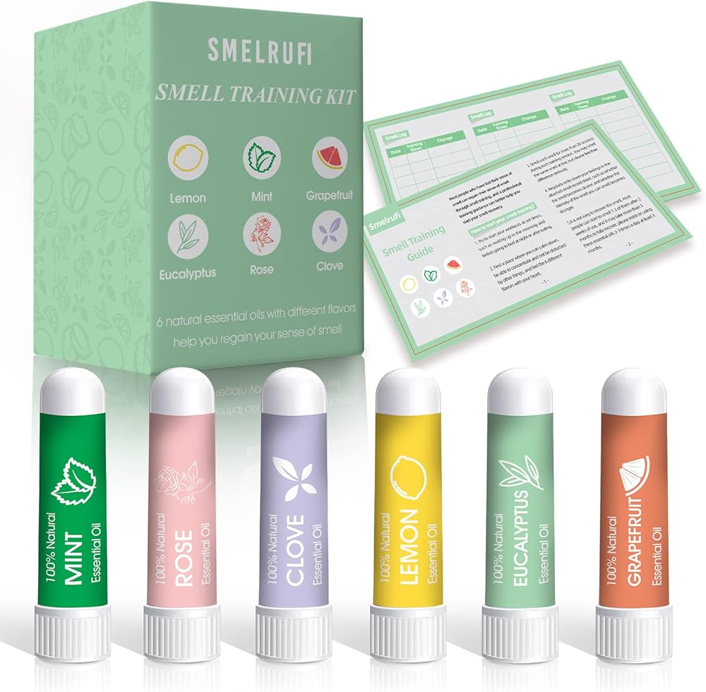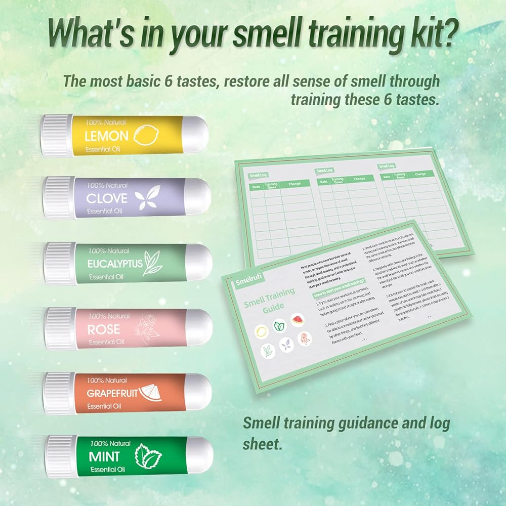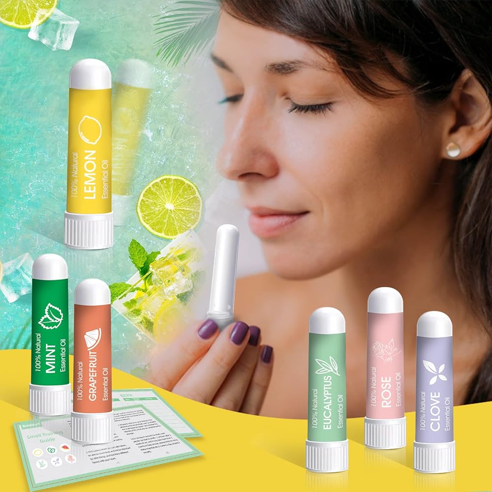 مجموعة التدريب على الرائحة من هيونوودو، 6 زيوت عطرية - الليمون والنعناع والورد والجريب فروت والقرنفل والأوكالبتوس وأجهزة الاستنشاق الأنفية تساعد على استعادة حاسة الشم، ومجموعة تدريب حاسة الشم مع دليل تدريب على الرائحة