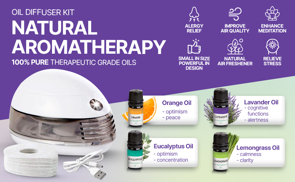 HELP YOU RELAX, FOCUS AND SPREAD FRAGRANCE. Our box contains 4 of the most popular and in demand natural essential oils and a mini oil diffuser. These 100% pure therapeutic grade essential oils set create an aromatherapy spa in your own home. Use any of the top 4 pure oils from orange, lavender, eucalyptus and lemongrass. Our portable usb essential oil diffuser can work also with batteries. aromatizador para casa, ambientadores para el hogar.