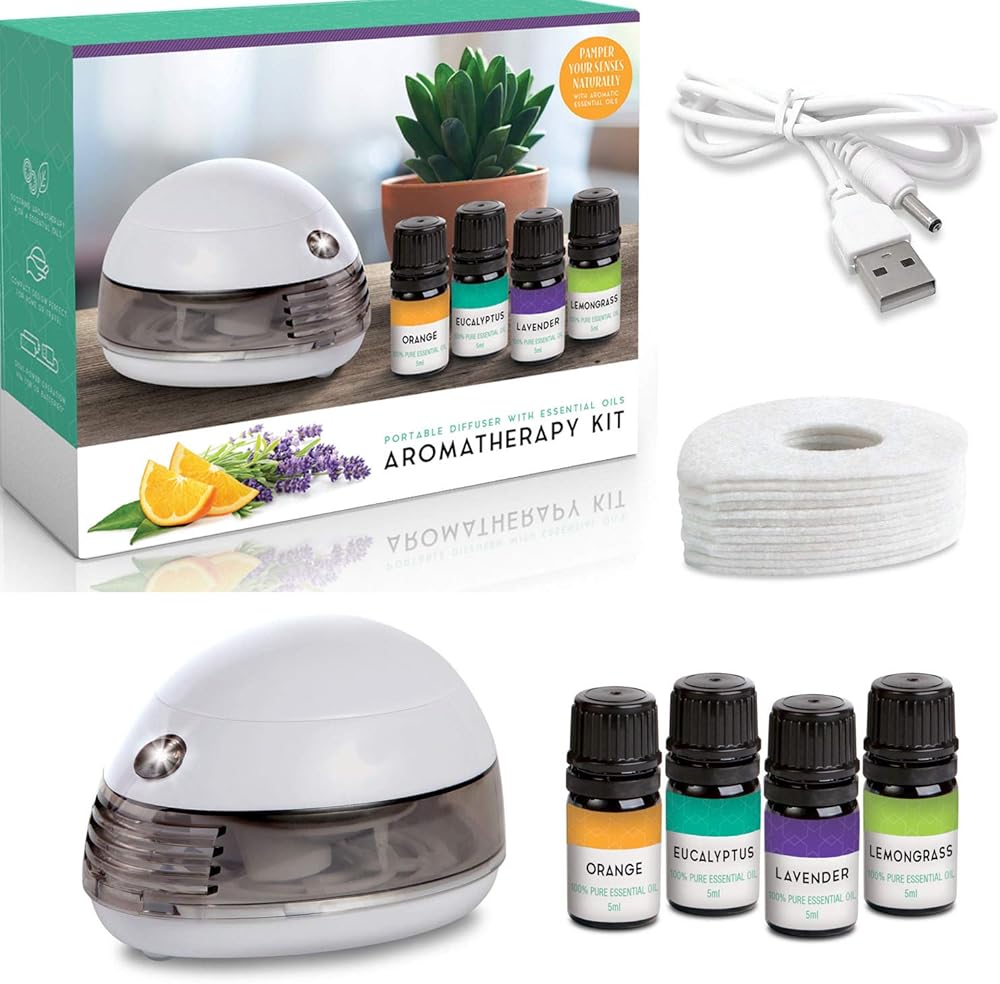 ناشر زيت صغير محمول - ناشر صغير للزيوت العطرية مع 4 عطور - برتقال، لافندر، أوكالبتوس، عشبة الليمون - ناشر روائح الزيوت العطرية المحمول أو USB المحمول يعمل بالبطارية