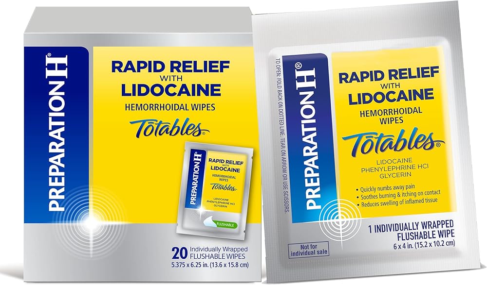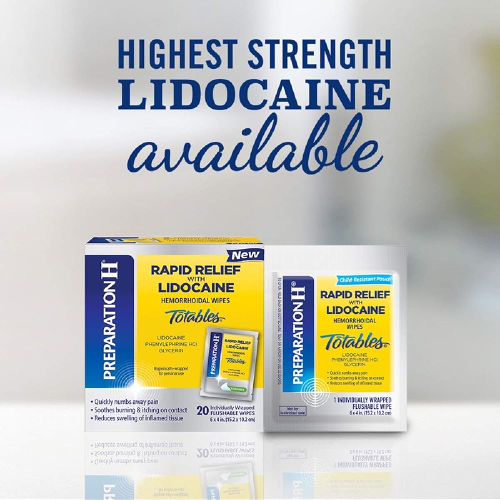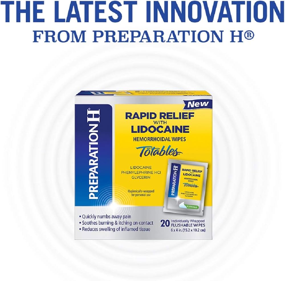 بريبريشن اتش مناديل مبللة للبواسير بالليدوكائين لتخفيف التورم والالم والحرق والحكة من رابيد ريليف - 20 قطعة