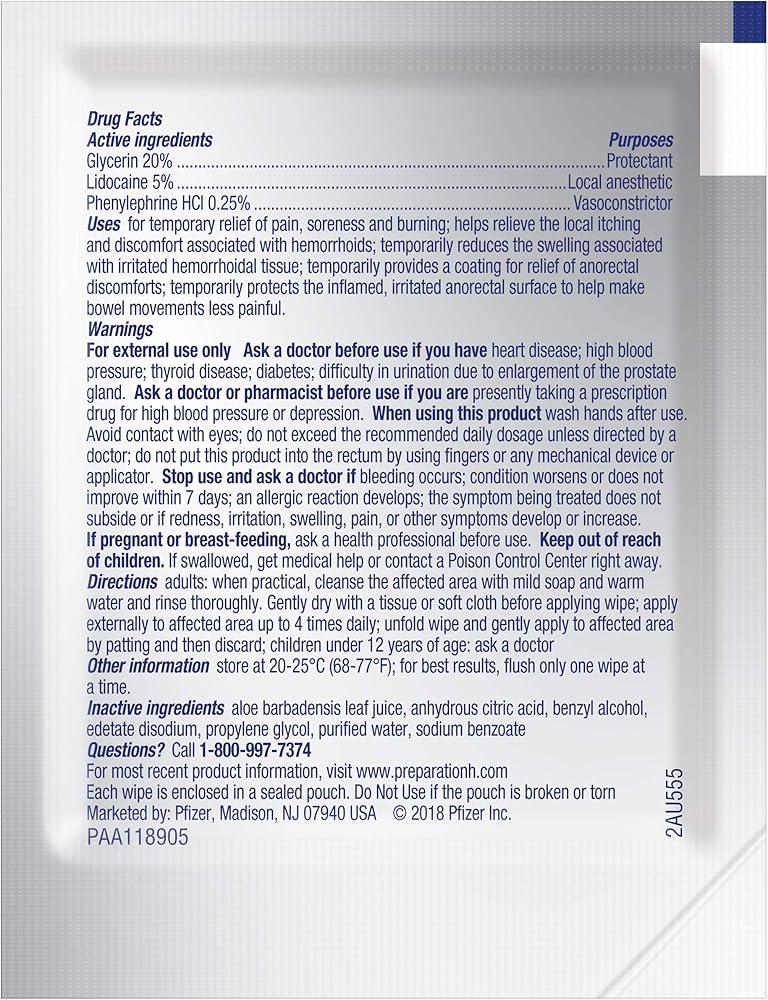 بريبريشن اتش توفر المناديل المبللة للبواسير مع الليدوكائين تخفيف سريع للألم والحكة والحرق الناجم عن البواسير في مناديل مريحة وسهلة الاستخدام. حتى التهيج الخفيف حول المؤخرة يمكن أن يكون مشكلة غير مريحة ومستمرة. عندما لا توفر علاجات البواسير الأخرى الراحة التي تحتاجها، فإن هذه المناديل المبللة القابلة للغسل والآمنة للصرف الصحي تجمع بين الراحة التي تثق بها من منتجات العناية بالبواسير بريبريشن اتش مع أقصى قوة ليدوكائين لتخدير الحرق المؤلم والحكة والفينيل ليفرين لتقليل التورم. بالإضافة إلى ذلك، توفر واقيات البشرة بما في ذلك الجلسرين طبقة واقية مهدئة وتعزز الشفاء هناك. تساعد هذه المناديل المبللة لتخفيف الحكة أيضًا على تقليل التورم المرتبط بالبواسير. ضعي مناديل بريبريشن اتش المبللة هذه حتى 4 مرات يوميًا للعناية بالبواسير سريعة المفعول. كن مرتاحًا مع تخفيف البواسير من بريبريشن اتش، العلامة التجارية رقم 1 التي يوصي بها الأطباء لعلاج البواسير. (1). (1) من بين العلامات التجارية او تي سي