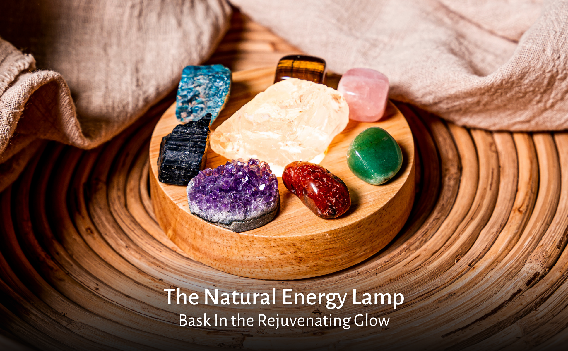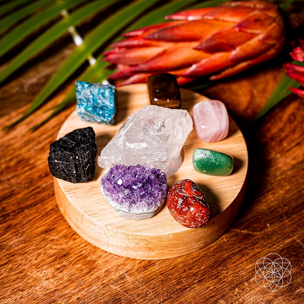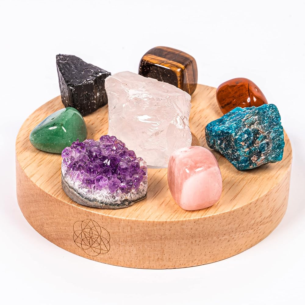 ثمانية بلورات طبيعية تتحد داخل هذا المصباح الحجري لتوفير الحماية والهدوء والحياة غور، والشفاء. كل حجر كريم خام له لون وتأثير فريد.