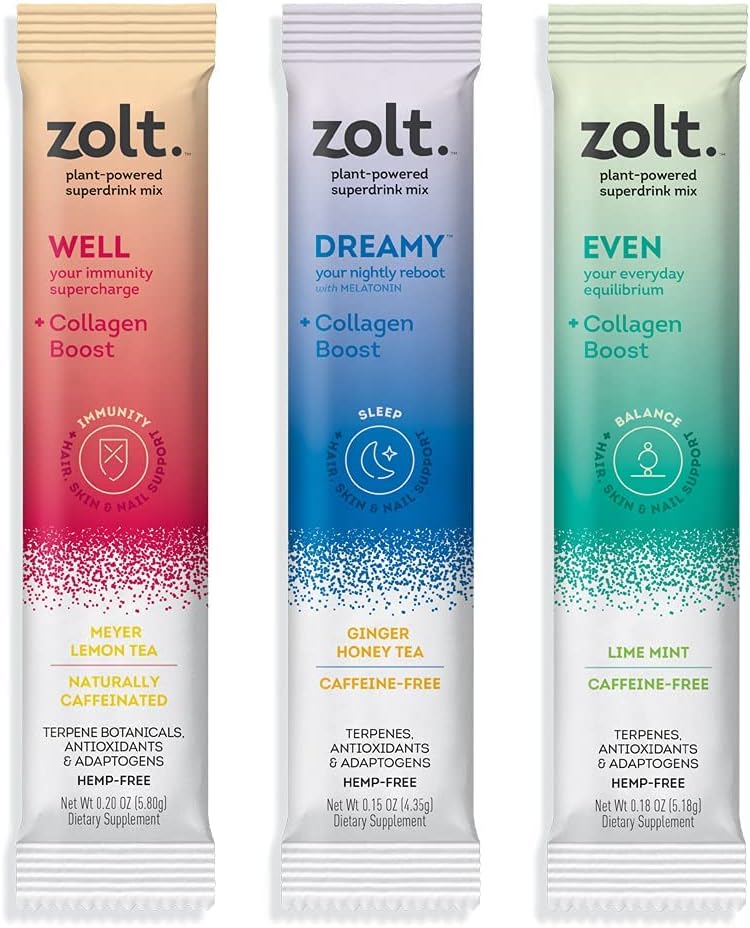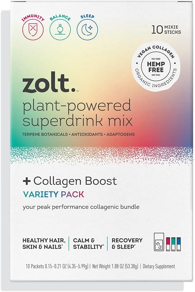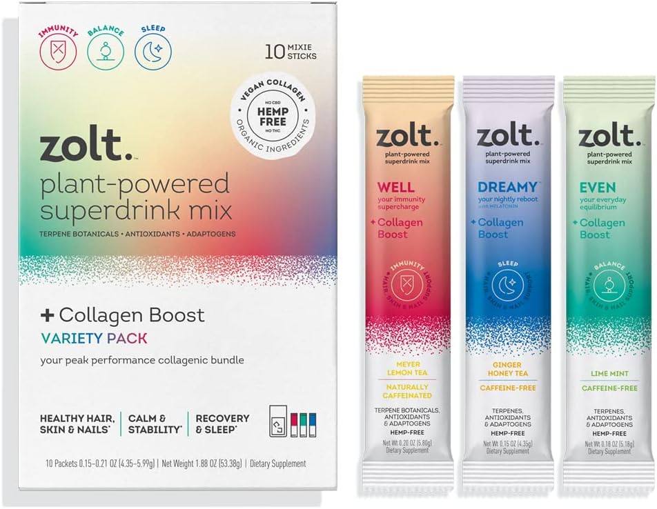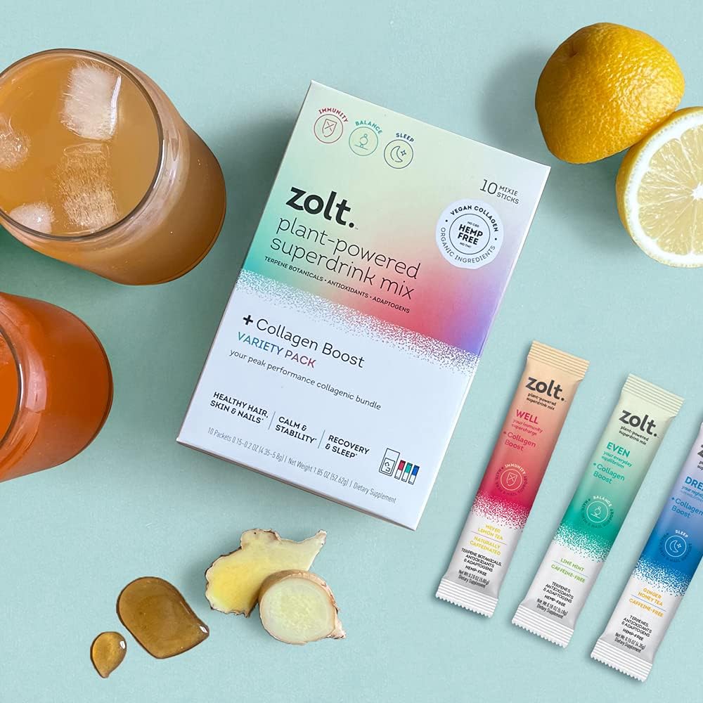 زولت مزيج المشروبات الفائقة المعزز بالنباتات + مجموعة متنوعة من الكولاجين المعزز، نكهات متنوعة، 10 عبوات