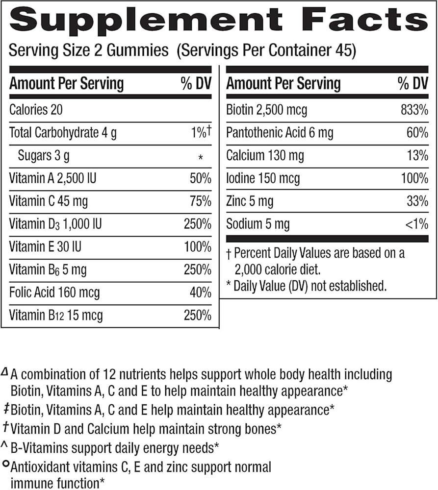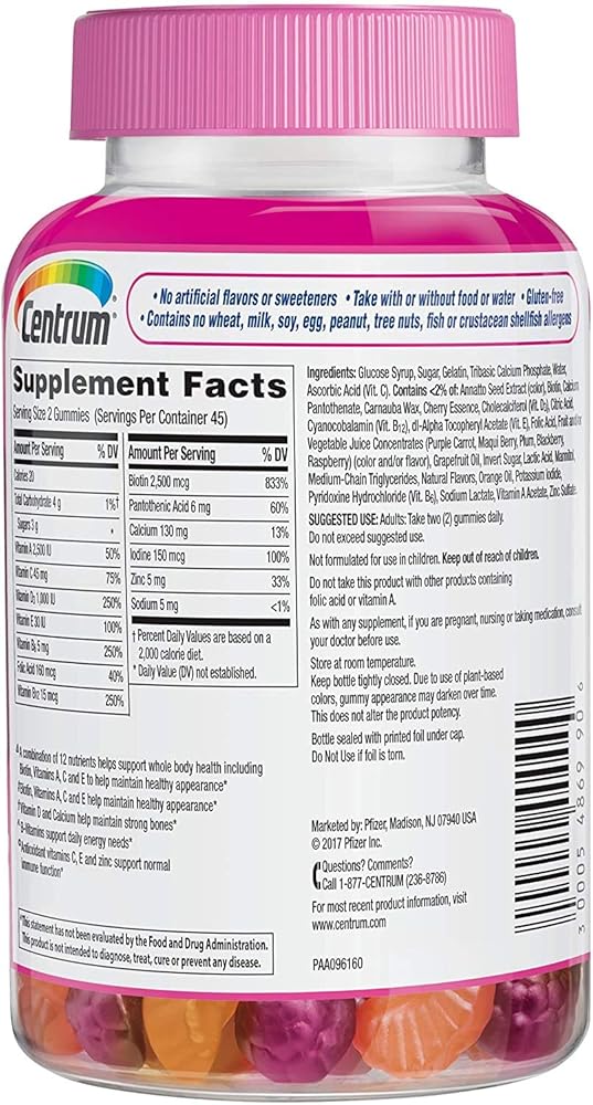 سينتروم فيتامينات متعددة الفيتامينات للنساء من مالتي بيوتي هي مكمل يومي متعدد الفيتامينات مركب من فيتامينات الشعر والبشرة والأظافر لدعم صحة الجسم وجميل. توفر هذه العلكة متعددة الفيتامينات مزيجًا من 12 عنصر غذائي رئيسي، بما في ذلك البيوتين وفيتامينات A، وللمساعدة في الحفاظ على المظهر الصحي، والفيتامينات والكالسيوم للمساعدة في الحفاظ على قوة العظام. توفر هذه الفيتامينات المتعددة للنساء أيضًا الفيتامينات لدعم احتياجاتك اليومية من الطاقة، ومضادات الأكسدة لدعم وظيفة المناعة الطبيعية. مصنوعة من مكونات خالية من الغلوتين ولا تحتوي على نكهات أو محليات صناعية، تأتي هذه العلكة متعددة الفيتامينات للنساء بنكهات الكرز والتوت والبرتقال الرائعة. قم بتغذية خلاياك، وقوّد حياتك مع سنتروم، العلامة التجارية التي يوصي بها الأطباء والصيادلة.