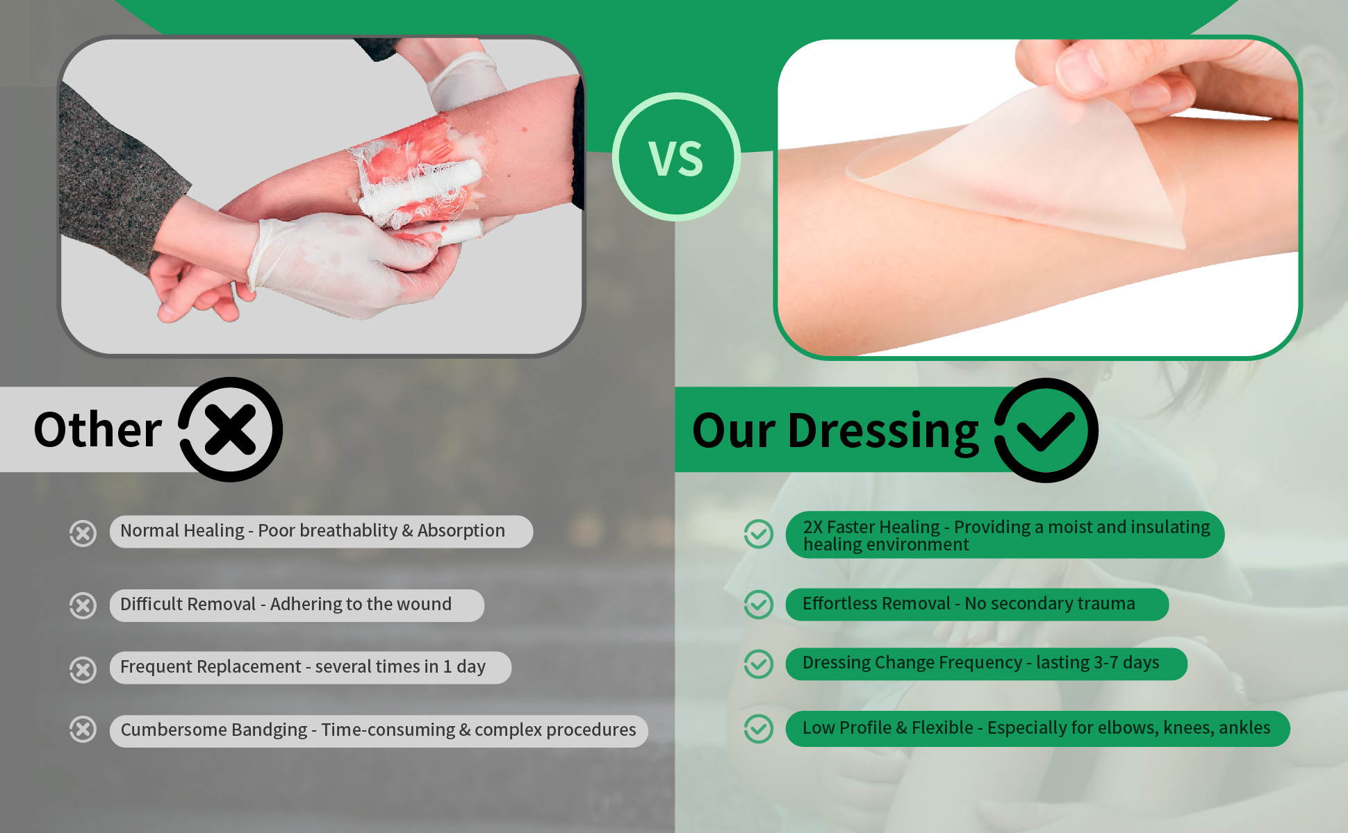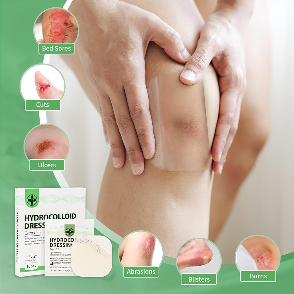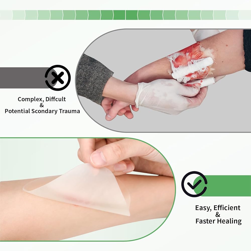 شفاء سريع: الضمادات الغروانية المائية، مصنوعة من مواد مرنة ومقاومة للماء مع عوامل تشكيل الهلام، تمتص السوائل بكفاءة. تساعد هذه الضمادات غير الملتصقة على الشفاء الطبيعي من خلال توفير العزل الحراري وتعزيز البيئة الرطبة.