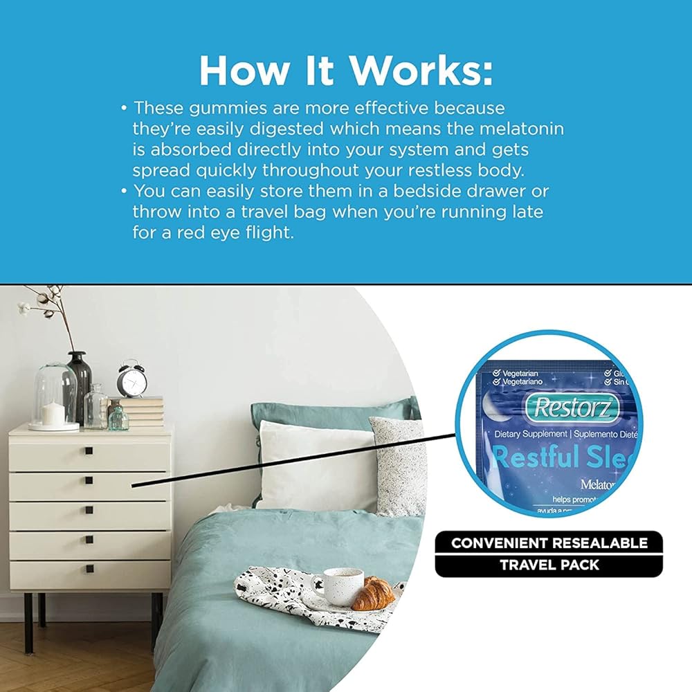 تعتبر علكة Restorz Restful Sleep أكثر فعالية لأنها سهلة الهضم. يمكنك بسهولة تخزين عبوات العلكة في درج بجانب السرير أو وضعها في حقيبة سفر للعناية بها أثناء التنقل.