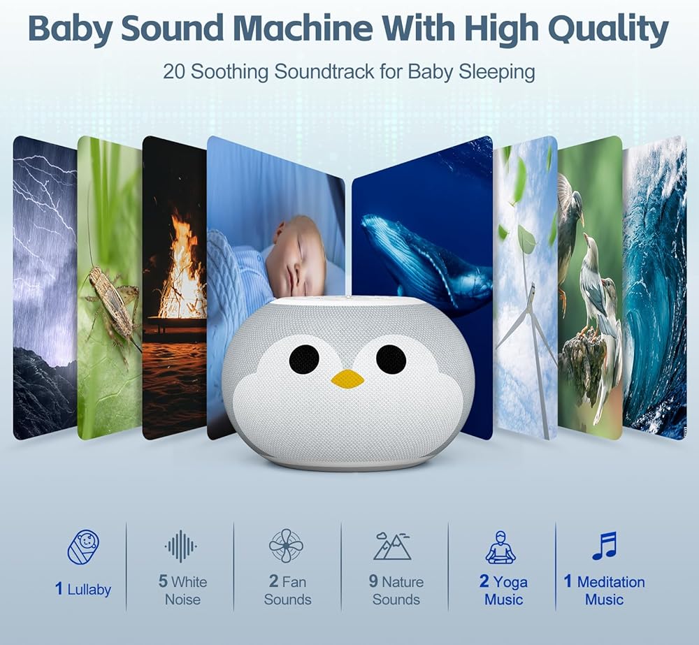 20 صوتًا مهدئًا وواضحًا للغاية للطفل: استمتع بالتهويدة، و5 ضوضاء بيضاء (ضوضاء بيضاء، بنية، وردية)، 2 أصوات للمروحة، 9 أصوات طبيعية، 2 موسيقى يوجا، وموسيقى التأمل التي تضمن الاسترخاء الغامر. تعرف الأمهات كم هو ثمين النوم. لمساعدة الرضيع الباكي على النوم بشكل سليم، قم بتشغيله لخلق جو نوم هادئ.
