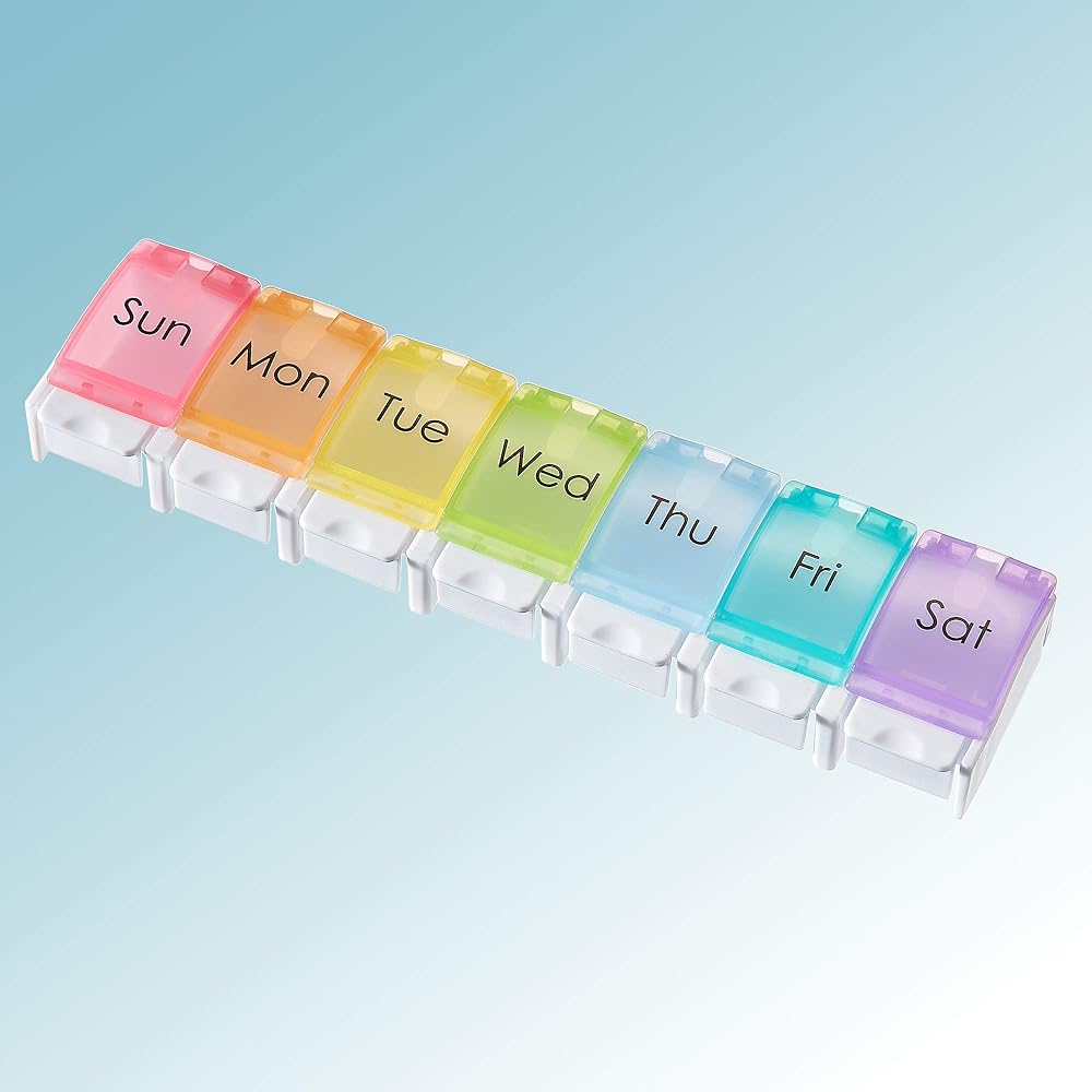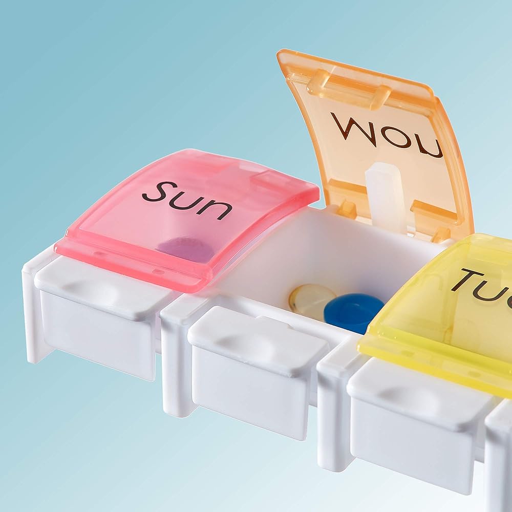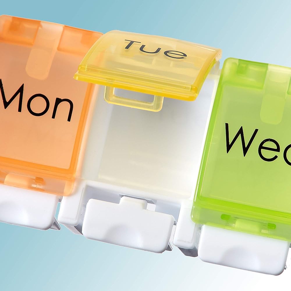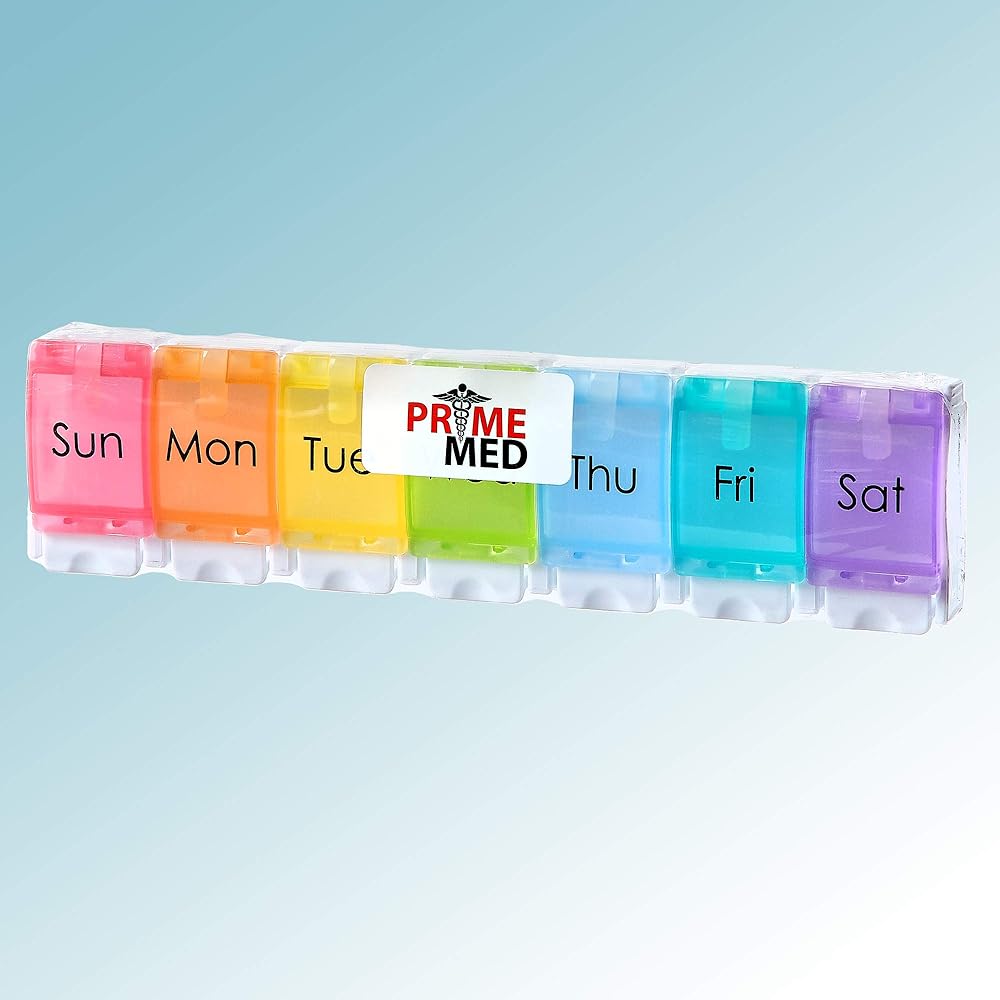- منظم أسبوع واحد - منظم حبوب يومي مشفر بالألوان من PrimeMed (7 أيام / أسبوع واحد) مع آلية ضغط بزر مفتوح
