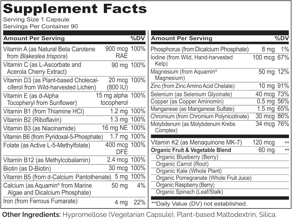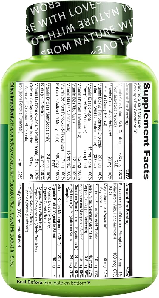 مكونات نباتية ممتازة: الفيتامينات الغذائية الكاملة لدينا مصنوعة من الفيتامينات والمعادن النباتية بما في ذلك فيتامين د3 من الأشنة، وفيتامين هـ من عباد الشمس، والكالسيوم والمغنيسيوم من الطحالب البحرية.
