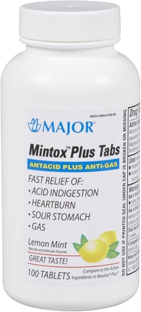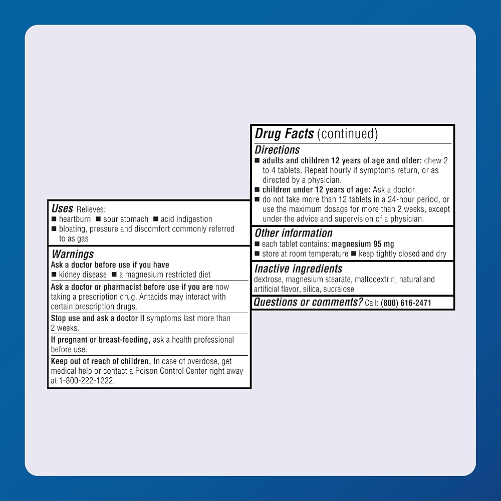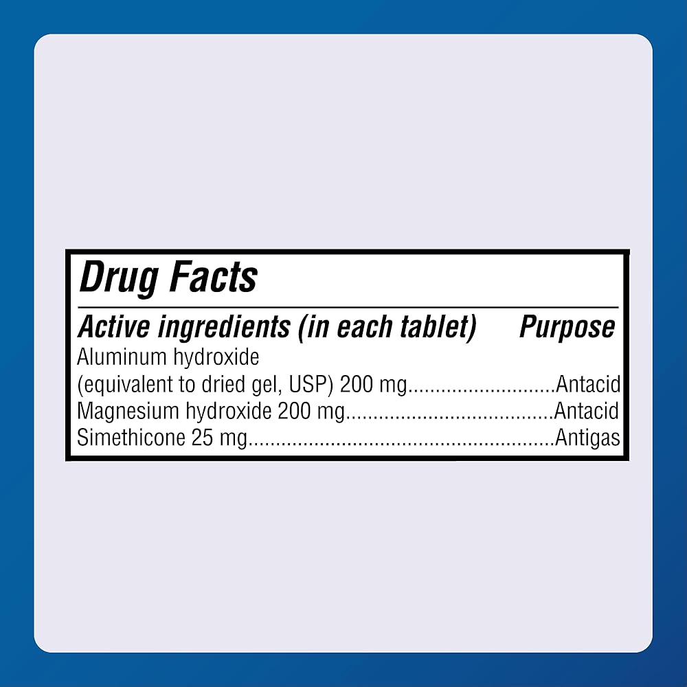 عدد 100 قطعة، يخفف حرقة المعدة وعسر الهضم الحمضي، ويساعد على الانتفاخ والانزعاج وضغط الغاز، مضاد للحموضة، ومضاد للغازات/الألومينا، والمغنيسيا، والسيميثيكون، يخفف من حرقة المعدة، وعسر الهضم الحمضي، والانتفاخ، وعدم الراحة، وضغط الغاز، امضغ 2 إلى 4 أقراص. كرر كل ساعة إذا عادت الأعراض، أو حسب توجيهات الطبيب. لا تتناول أكثر من 12 قرصًا خلال فترة 24 ساعة، أو استخدم الجرعة القصوى لأكثر من أسبوعين، إلا تحت نصيحة وإشراف الطبيب. معلومات أخرى: يحتوي كل قرص على: مغنيسيوم 95 ملجم. يُخزن في درجة حرارة 59-77 فهرنهايت. المكونات النشطة الاسم القوة هيدروكسيد الألومنيوم 200 ملجم هيدروكسيد الماغنيسيوم 200 ملجم سيميثيكون 25 ملجم.