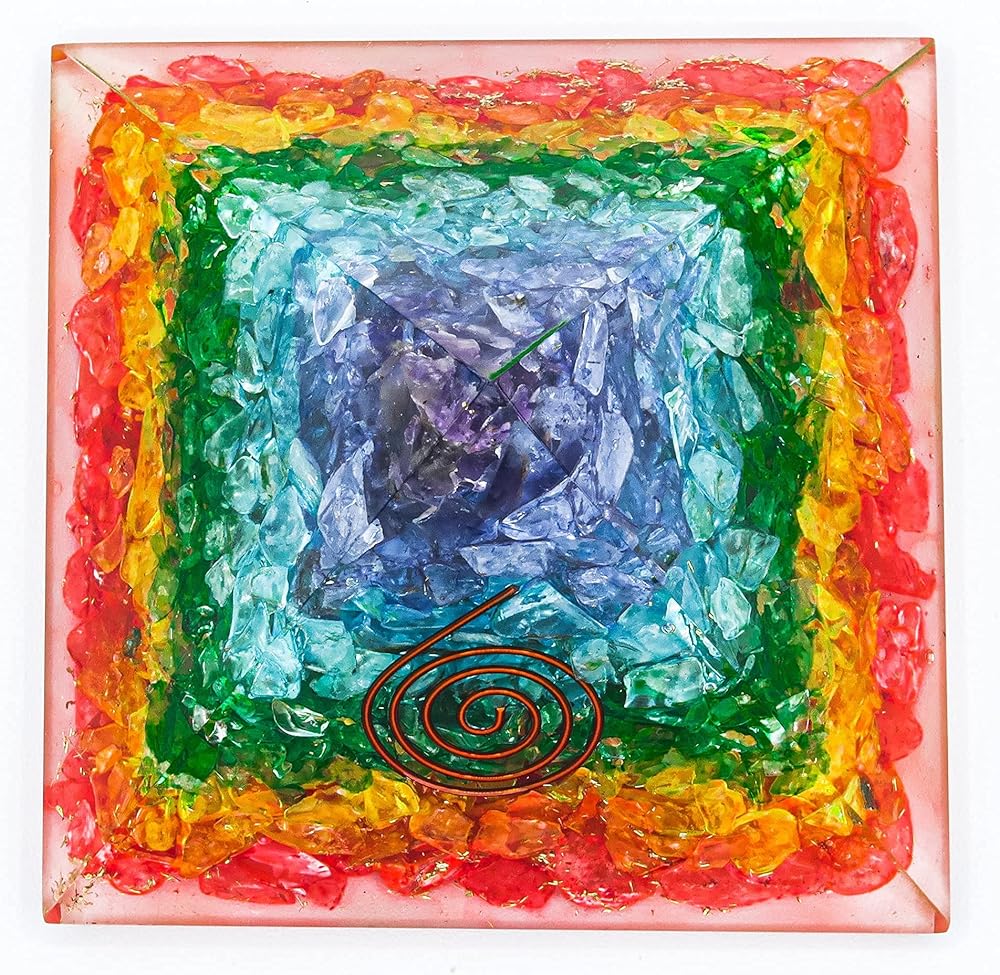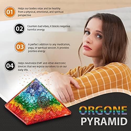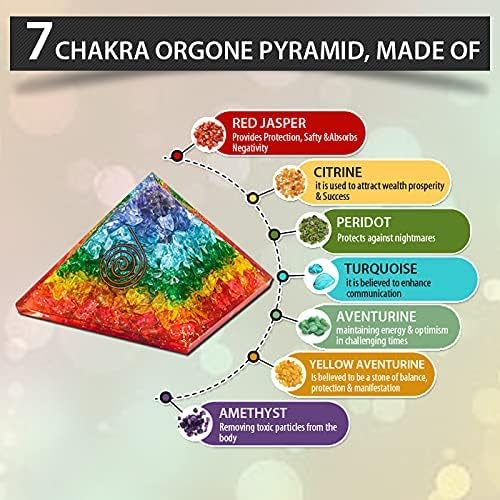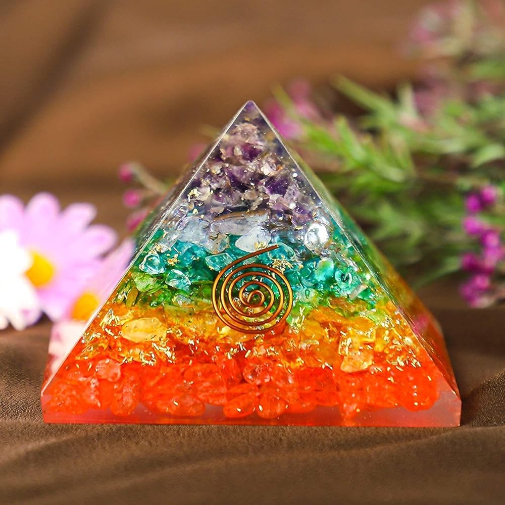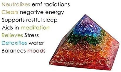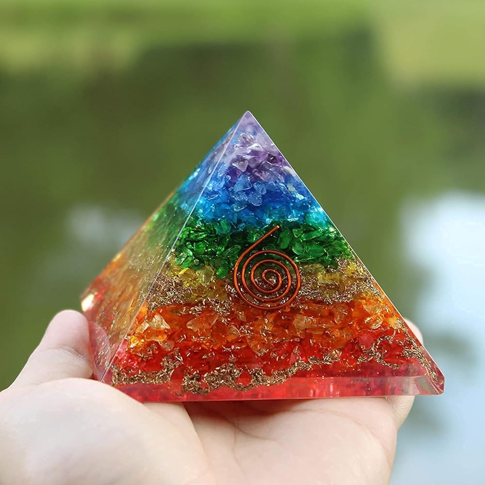 هرم الأورجون الشاكرا السبع مصنوع يدويًا بمهارة من الأحجار الكريمة الطبيعية العلاجية والمعادن الأرضية. مزيج من هذه العناصر يخلق أورغون، المعروف أيضًا باسم تشي وبرانا وطاقة لايف فورس.