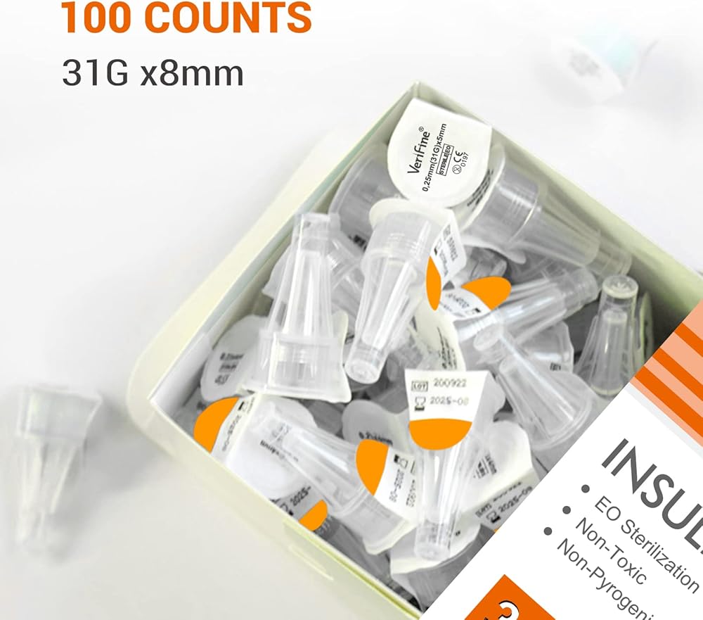 إبر قلم أنسولين فيريفاين 31 جرام 8 مم، إبر دقيقة للغاية لحقن الأنسولين، متوافقة مع معظم أقلام الأنسولين (عبوة من 100)