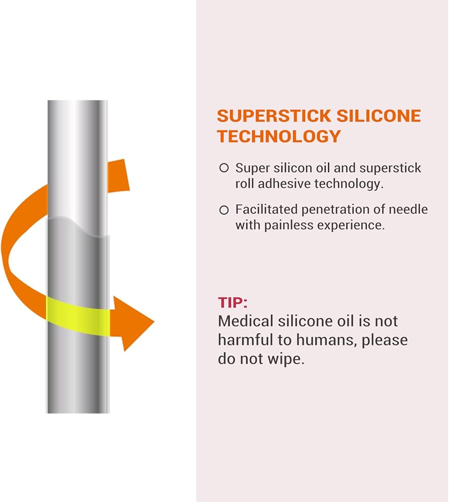 • حقن خالٍ من الألم: إبرة قلم رفيعة للغاية ذات 3 مشطوفة مع تقنية جدار رفيعة تضمن تدفق أفضل للسوائل. كل طرف مطلي بمادة تشحيم السيليكون لتقليل الانزعاج وزاوية حادة 18 درجة لتسهيل الحقن