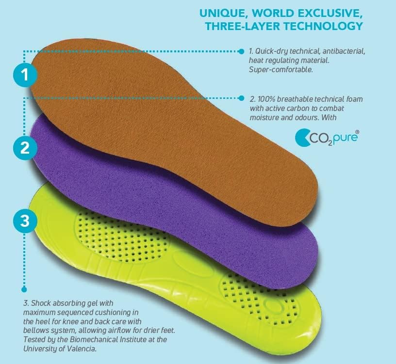 OUR DIFFERENCE is your benefit: Footgel uses a patented sequential shock absorption design whose architecture absorbs the impact of walking or running, reducing pressure on the joints in general and neutralizing the impact chain: FOOT › KNEE › HIP › LOWER BACK for a comfortable feeling of well-being and maximum comfort.