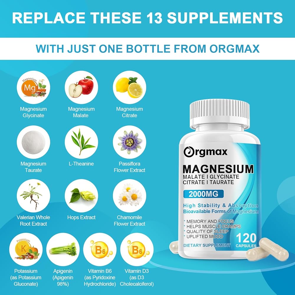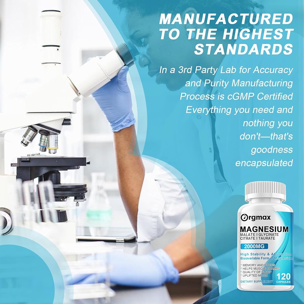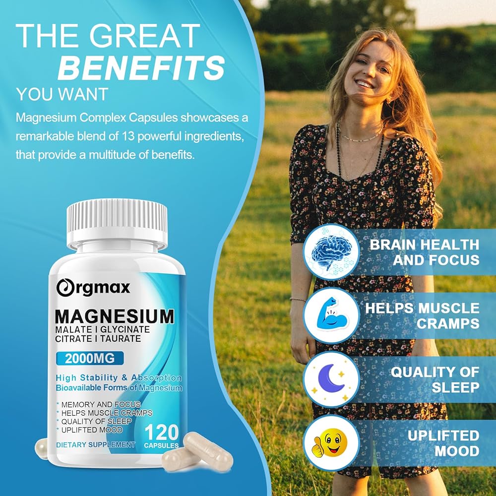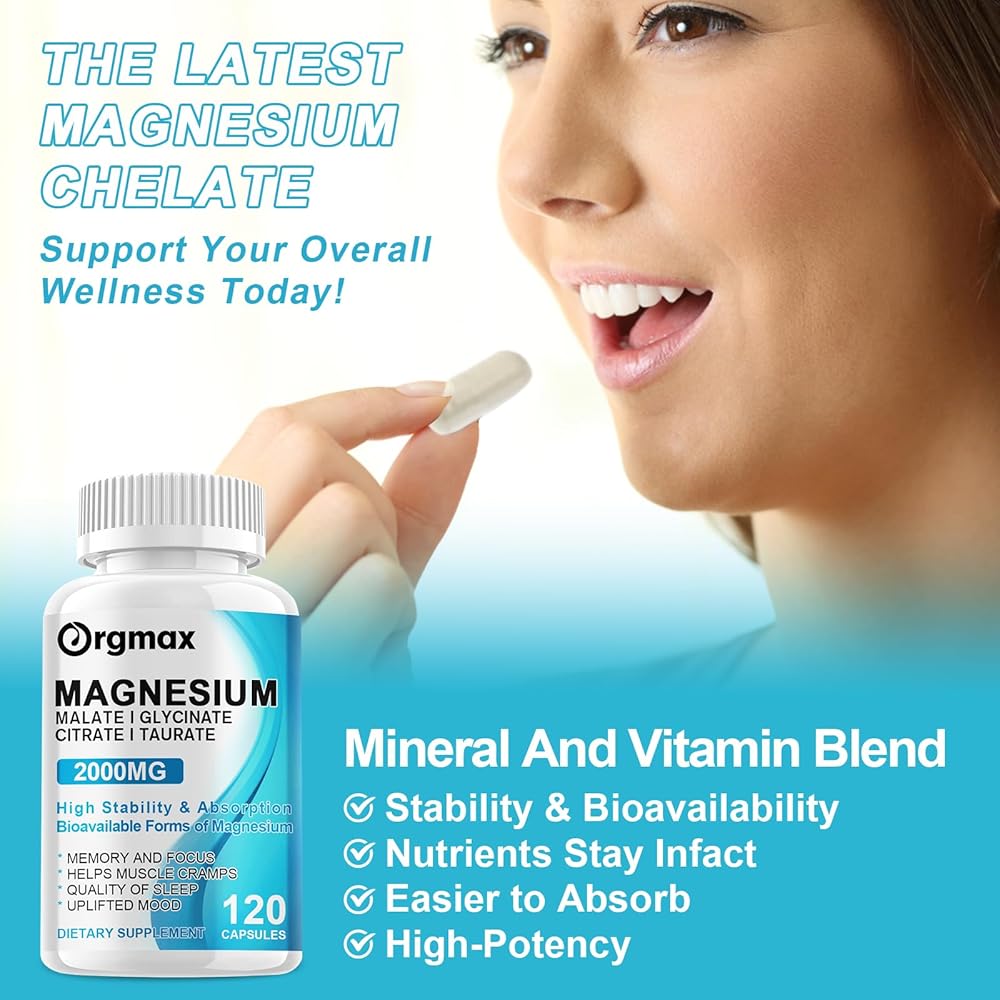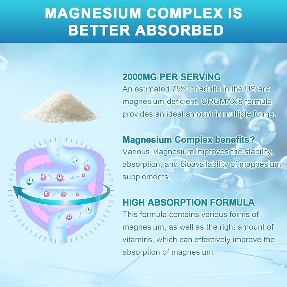 • أقصى قدر من الامتصاص والفعالية - مركب المغنيسيوم ORGMAX هو مكمل قوي يضم أربعة أنواع من المغنيسيوم النقي (Glycinate، Malate، Citrate، Taurate 500mg لكل منهما). تضمن تركيبتنا أقصى قدر من التوافر البيولوجي حيث أن كل شكل من أشكال المغنيسيوم قابل للامتصاص بدرجة عالية. مع مركب المغنيسيوم الخاص بنا، لن تحصل على تركيبة صديقة للمعدة فحسب، بل ستحصل أيضًا على أقصى استفادة من كل جرعة.