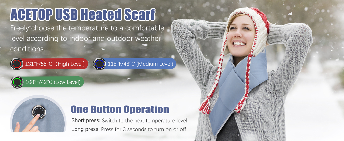 ☃ 3 مستويات تسخين ☃ يمكن أن تسخن وسادة الرقبة للتدفئة الشتوية بسرعة خلال 5 ثوانٍ وهي متوفرة في 3 مستويات لدرجة الحرارة في ترتيب 131 درجة فهرنهايت/55 درجة مئوية (الضوء الأحمر) → 118 درجة فهرنهايت/48 درجة مئوية (الضوء الأزرق) → 108 درجة فهرنهايت/42 درجة مئوية (الضوء الأخضر). اضغط لفترة قصيرة للتبديل إلى مستوى درجة الحرارة التالي، واضغط لفترة طويلة لمدة 3 ثوانٍ للتشغيل أو الإيقاف. يمكنك ضبط درجة الحرارة إلى مستوى مريح وفقًا لظروف الطقس الداخلية والخارجية.