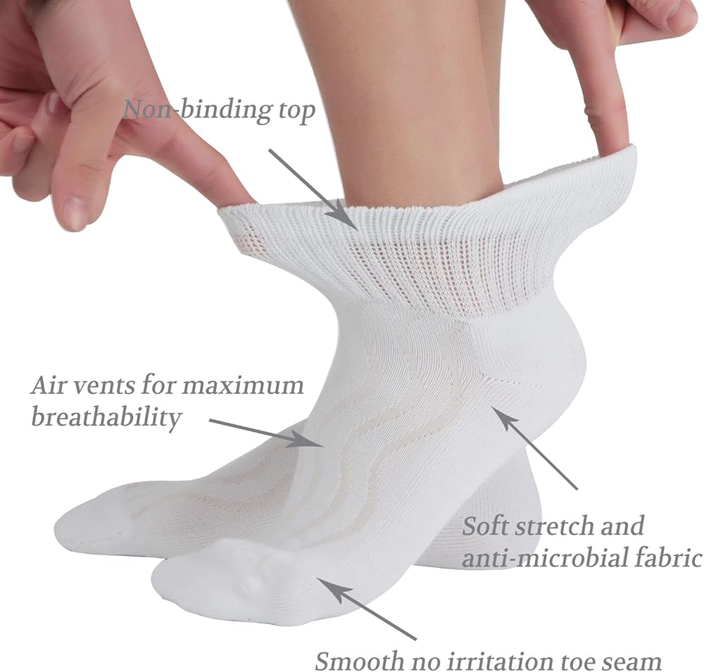 موصى بها: يوصى بشدة بهذه الجوارب للأشخاص الذين يعانون من مرض السكري والوذمة والاعتلال العصبي الناجم عن مشاكل الدورة الدموية و/أو تورم القدمين والكاحلين وغيرها من مشاكل القدم/الكاحل ذات الصلة. يسمح الجزء العلوي الفضفاض وغير المربوط بتدفق الدم دون عوائق، مما يعزز الدورة الدموية.