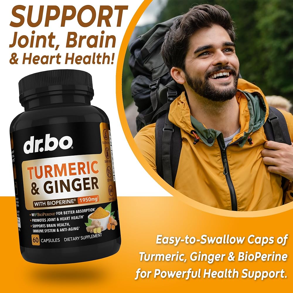 البيوبيرين والزنجبيل للحصول على أقصى قدر من الامتصاص - يساعد البيوبيرين، وهو مستخلص الفلفل الأسود الحاصل على براءة اختراع، على امتصاص أفضل بما يصل إلى 2000 مرة من كبسولات الكركم النقية. الزنجبيل والكركمين لصحة المفاصل.