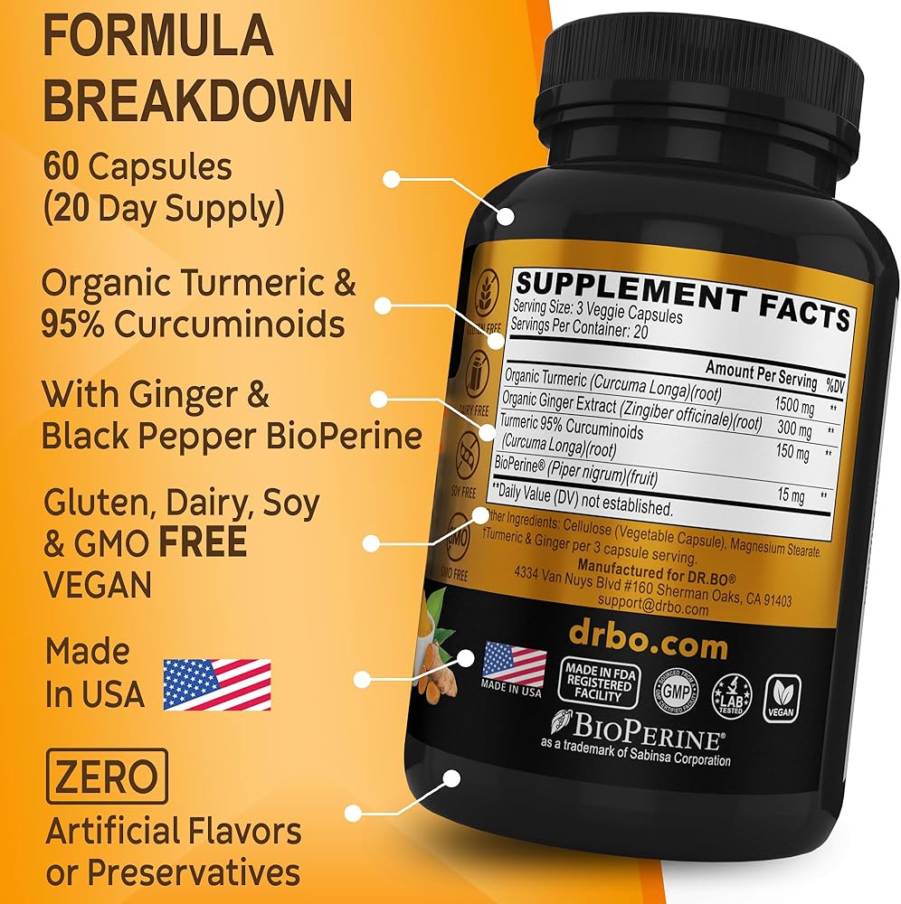 فعالية عالية - تستخدم مكملات الكركمين والكركمين العضوية من دكتور بو أفضل أنواع الكركم والزنجبيل. حبوب الكركم عالية الجودة، أقوى الكركمين الكركم مع بيوبيرين الفلفل الأسود.