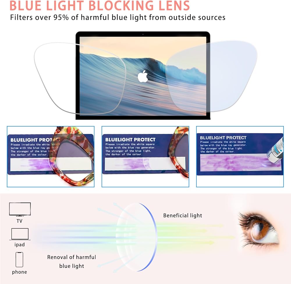 • الضوء الأزرق المضاد: يمكن للزجاج المضاد للأزرق أن يحجب بشكل فعال 90% من الضوء المرئي بطول موجي يتراوح بين 415 و455 نانومتر. يمكن لهذه النظارات أن تحمي عينيك من التلف عند استخدام المنتجات الرقمية، وتقلل من تعب النظارات، وتحسن النوم.