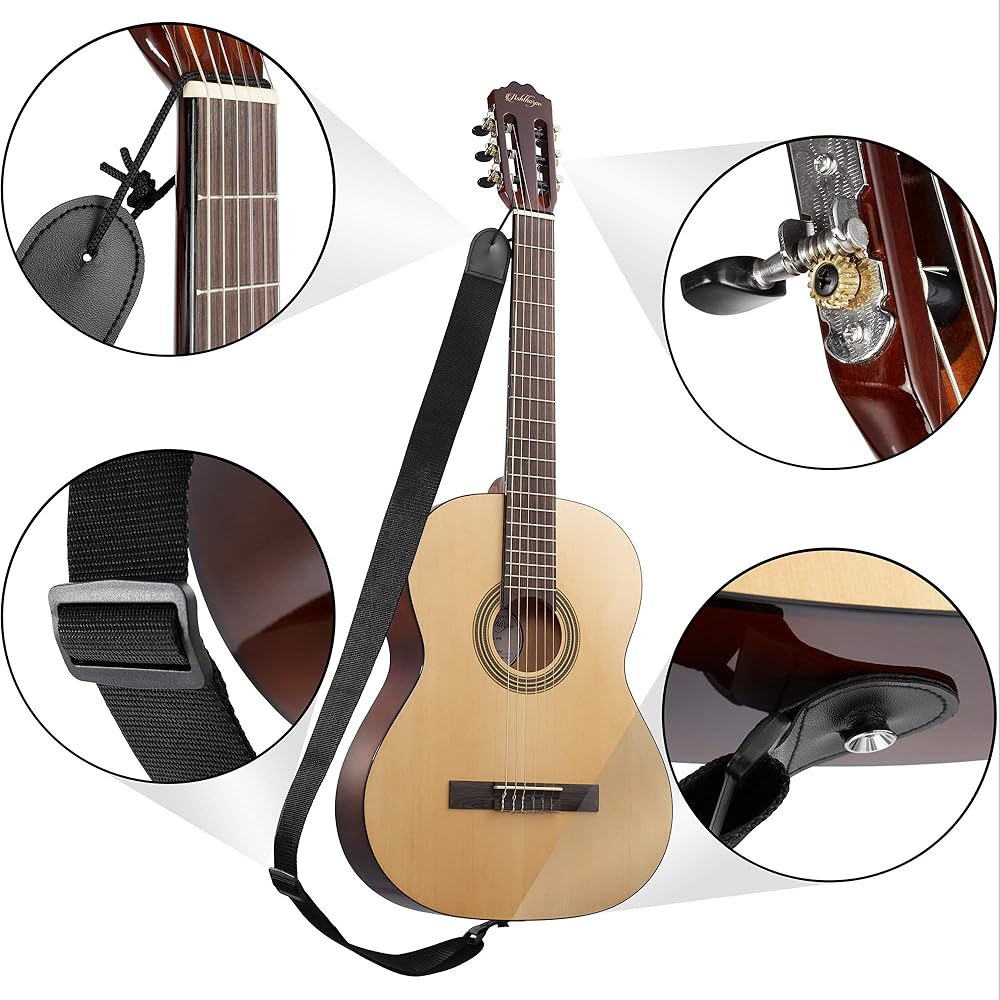مصممة بشكل جميل، دون إغفال التفاصيل. يتميز هذا الجيتار الصوتي الكلاسيكي برقبة عريضة كلاسيكية وجسر من خشب الجوز و19 حلقة ناعمة وقضيب تروس مزدوج الحركة ورأس آلة بطول 3 انش بلمسة نهائية احترافية وأوتاد ضبط عالية الطراز. نغمات كاملة ومشرقة من الموسيقى الكلاسيكية والفلامنكو الشعبية التقليدية وموسيقى الجاز في انتظار تشغيلها.
