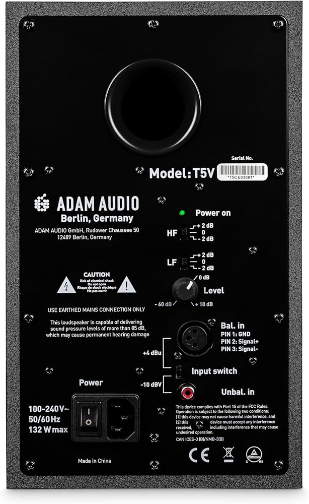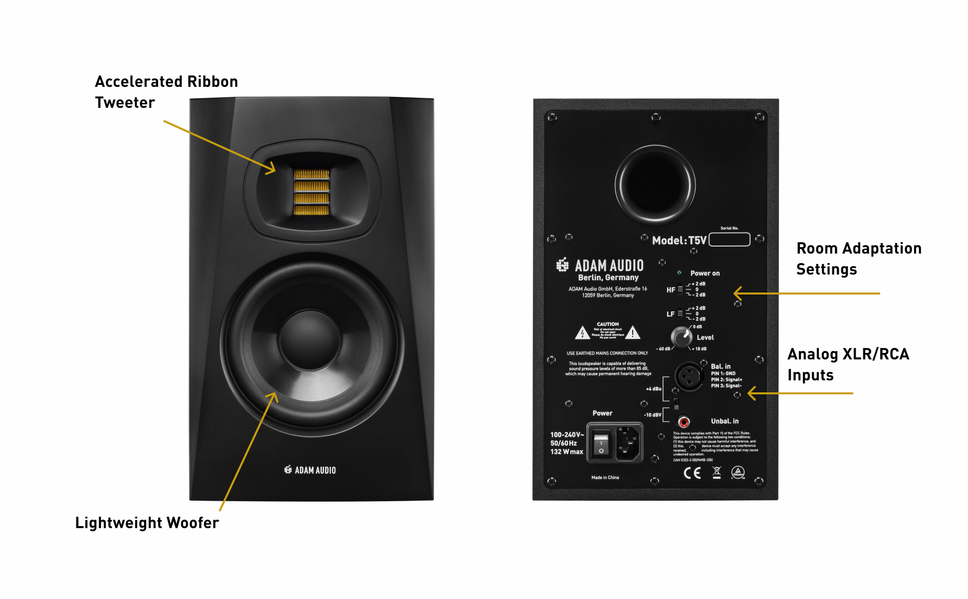 إن T5V عبارة عن شاشة مراقبة قريبة المدى ثنائية الاتجاه وبأسعار معقولة للغاية، وهي مُحسّنة لغرف التحكم الصغيرة. بفضل مكبر الصوت مقاس 5 بوصات، تمتد استجابة التردد الجهير لجهاز T5V إلى 45 هرتز. مكبر الصوت U-ART الجديد، وهو حل مبتكر للاستخدام في التسجيل والمزج عالي الدقة بميزانية محدودة، يصل إلى 25 كيلو هرتز ويقترن بدليل موجي دقيق له نفس سمات التحكم في التشتت مثل الانتشار عالي التردد (HPS). الدليل الموجي المستخدم في شاشات سلسلة S الرائدة من ADAM Audio. يوفر التشتت الموحد للغاية للترددات العالية للدليل الموجي نقطة رائعة واسعة بشكل لا يصدق والتي تحررك من الالتصاق بموضع مزيج صلب أثناء العمل. تسمح الخزانة المشطوفة المزودة بمنفذ انعكاس صوت الجهير الخلفي ومساحة صغيرة بوضعها في أي مكان في غرفتك، بغض النظر عن مدى صغر حجمها، وتحتوي على عمليات انتقال وتوازن مدمجة للسائق يتم التحكم فيها بواسطة DSP بالإضافة إلى اتصالات تناظرية متعددة الاتجاهات. مزود بمضخم صوت من الفئة D بقوة 50 وات لمكبر الصوت ومكبر صوت من الفئة D بقدرة 20 وات لمكبر الصوت U-ART، وينتج T5V مستويات ضغط صوت (SPL) تصل إلى 106 ديسيبل لكل زوج. إن الخصائص الصوتية الممتازة والأبعاد الصغيرة ونسبة التكلفة/الأداء المتميزة تجعل شاشة الاستوديو هذه مناسبة تمامًا للاستخدام في غرف التحكم الصغيرة في إنتاج الموسيقى والفيديو والبث. إذا كنت بحاجة إلى سماع المزيد من النهاية السفلية، فإن T5V متوافق مع مضخم الصوت ADAM Audio T10S.