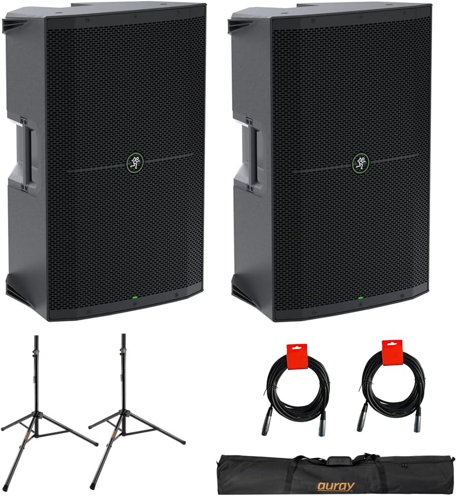 حزمة نظام مكبر الصوت PA من Mackie Thump215 بقدرة 1400 وات 15 بوصة (زوج) مع حوامل مكبر صوت فولاذية Auray SS-47S-PB، وحقيبة حمل، وكابل 2X 20 XLR-XLR
