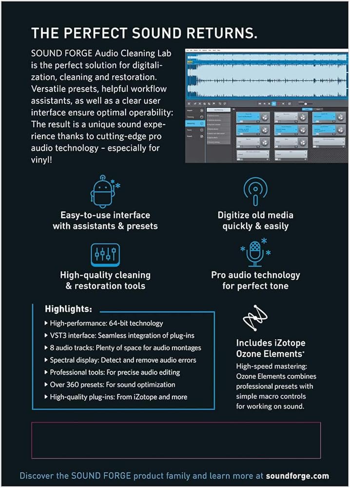 يُعد معمل تنظيف الصوت Sound Forge الجديد أداة متخصصة لسهولة رقمنة الصوت وتنظيفه واستعادته. يقدم البرنامج مجموعة من الإعدادات المسبقة المختارة والحلول العملية بنقرة واحدة والتي تم تصميمها خصيصًا لهذا المجال من التطبيق. يعد مختبر تنظيف الصوت، إلى جانب مجموعة من الوظائف الأخرى، بمثابة سكين الجيش السويسري الرقمي الذي يجب أن يكون أحد مكونات أي جهاز كمبيوتر. يحل معمل تنظيف الصوت Sound Forge محل نطاق معمل تنظيف الصوت magix. اكتشف الجيل الجديد من البرامج بقوة 64 بت وغير ذلك الكثير. الحد الأدنى لمتطلبات النظام: معالج بسرعة 1 جيجاهرتز؛ 2 جيجا بايت رام؛ بطاقة صوت مدمجة، وبطاقة رسومات مدمجة، والحد الأدنى من الدقة 1280 × 768؛ مساحة على القرص الصلب تبلغ 1 جيجابايت. اتصال بالإنترنت: مطلوب لتسجيل البرنامج والتحقق من صحته، وكذلك لبعض وظائف البرنامج. يتطلب البرنامج التسجيل لمرة واحدة.