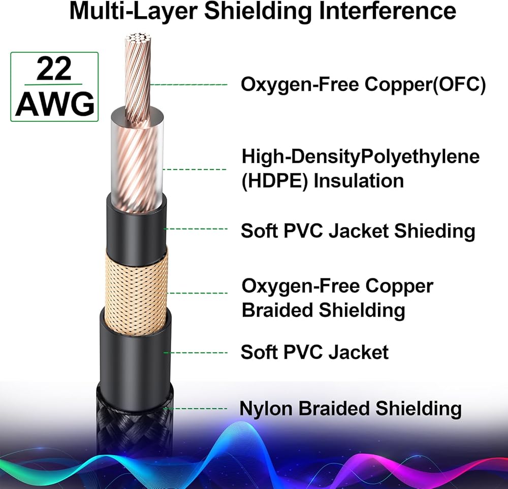 * حماية درع مزدوجة الطبقات - يعتمد كابل الآلة الموسيقية هذا على تصميم درع هاي فاي، رقائق الألومنيوم + درع لف معدني، يقلل من التداخل الكهرومغناطيسي الخارجي، سعة النطاق، حماية وتصفية تداخل EMI/RFI، تقليل الضوضاء المزدوجة، رفض مشكلة تيار الضوضاء، جودة صوت واضحة بدون ضوضاء، تأثير موسيقى هاي فاي الحالي، أداء حي أكثر مثالية.