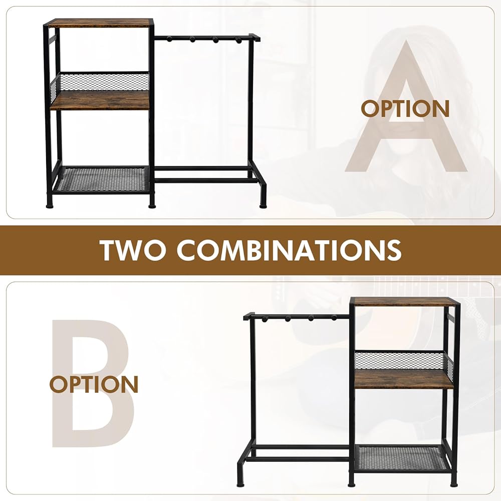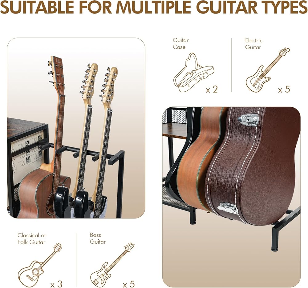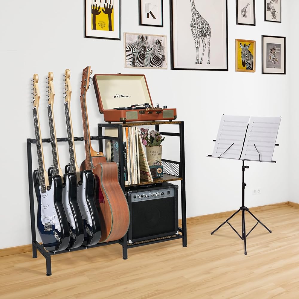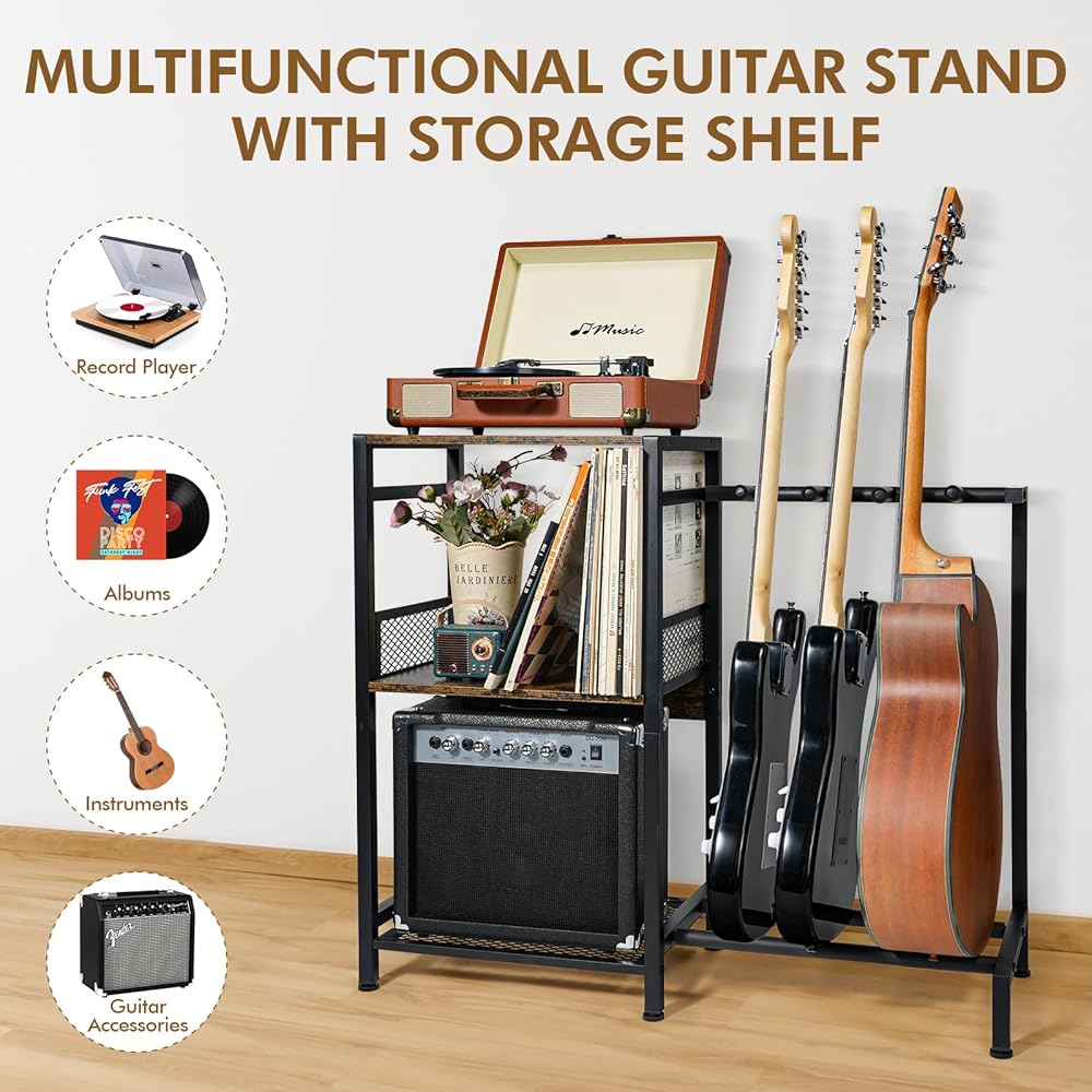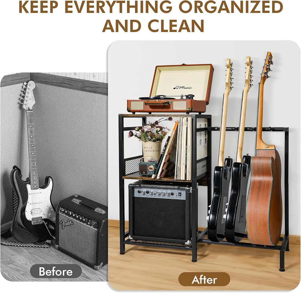 رف جيتار على الأرض من ikkle لـ 4 جيتار متعددة، حامل جيتار قابل للتعديل مع منافذ طاقة للصوت، والباس، والكهرباء، ورف تخزين ثلاثي الطبقات لملحقات أمبير الجيتار