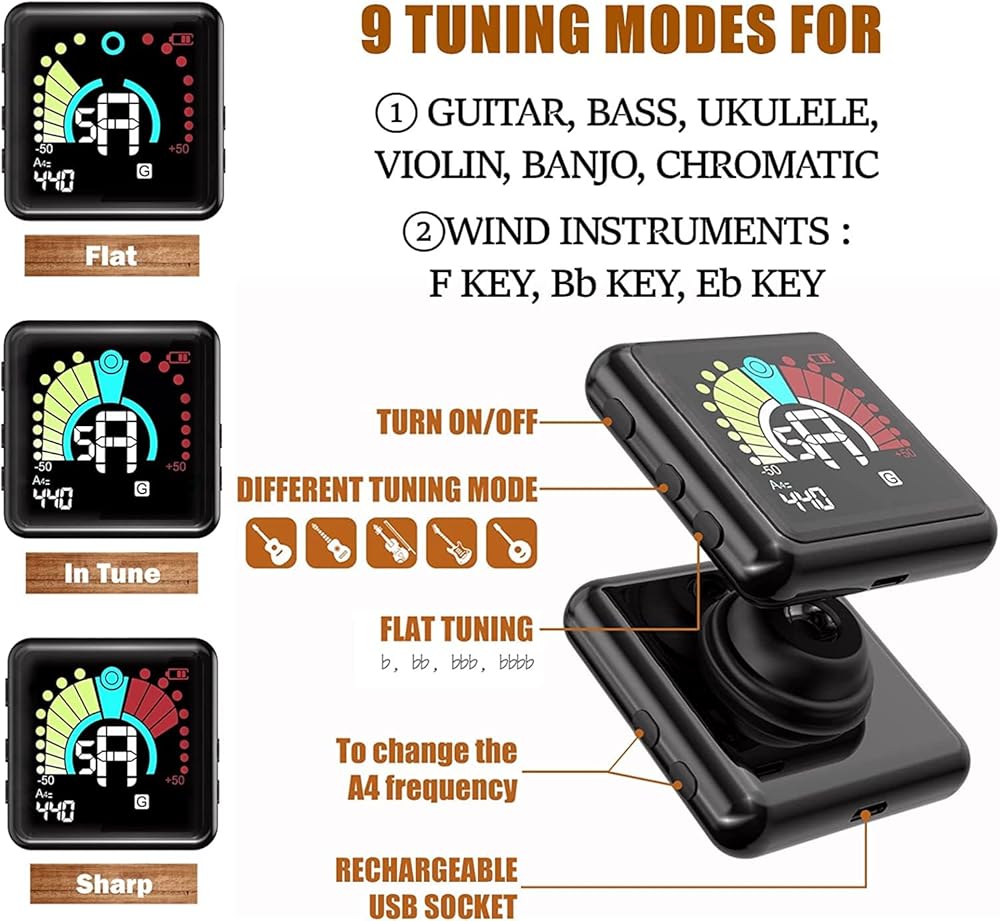 • ♪ موالف قابل لإعادة الشحن: يتم شحنه بسرعة باستخدام كابل USB المرفق ولا يحتاج إلى أي بطارية زر مزعجة! إيقاف التشغيل التلقائي بعد 3 دقائق من عدم وجود إشارة لتوفير الطاقة.
