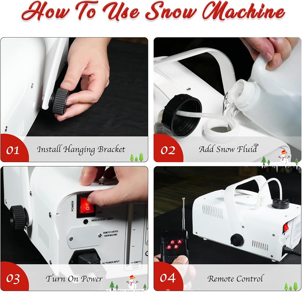 Portable and Easy to Use -- With its compact and lightweight design, the Snow Machine is highly portable and can be easily carried to any location. Simply fill the tank with the provided snow fluid, plug it in, and watch as a flurry of snowflakes fill the air.