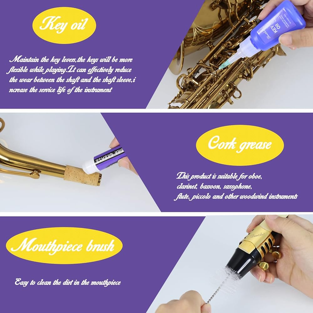 We carefully choose high quality materials to produce this kit, simple cleaning with saxophone swabs + dust brush (mouthpiece brush, toothbrush), special scientifically formulated lubricant with child safety cap It can effectively reduce the wear and tear between the shaft and bushing and increase the life of your instrument.