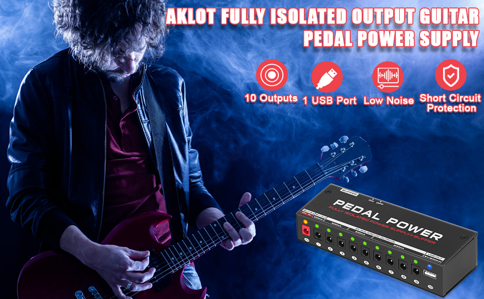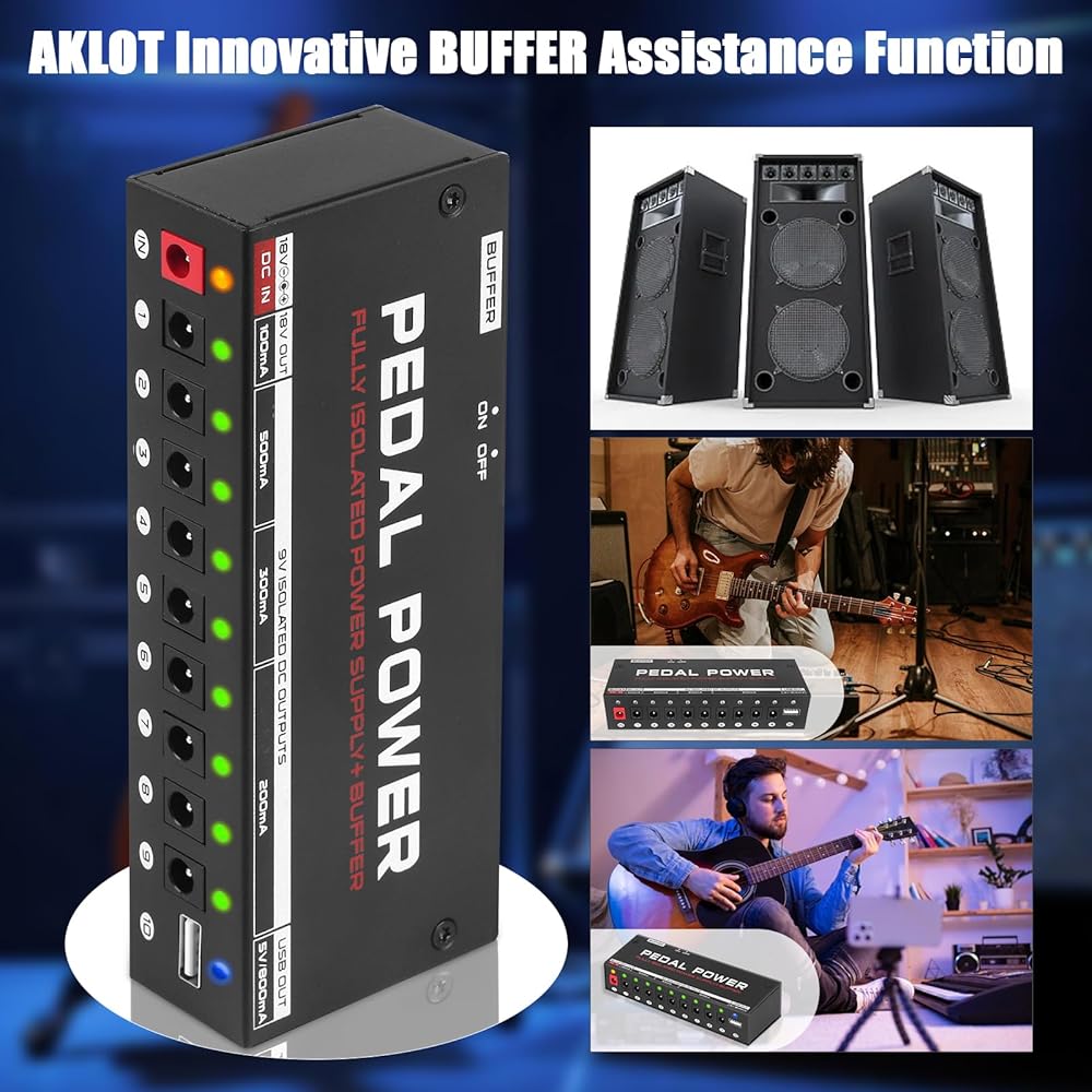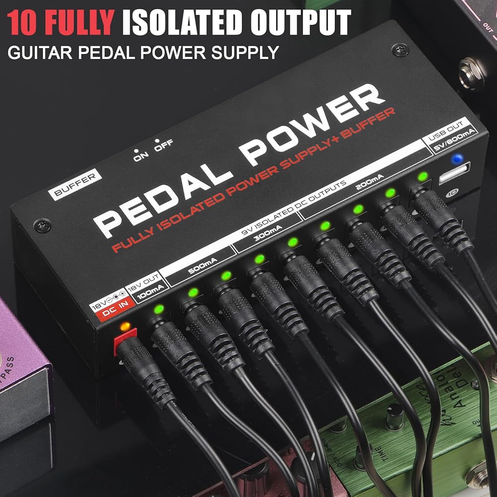 10 مخارج معزولة: مزود طاقة دواسة الجيتار الخاص بنا معزول بالكامل، والذي يتضمن 1 × 18 فولت/100 مللي أمبير، 2 × 9 فولت/300 مللي أمبير، 2 × 9 فولت/500 مللي أمبير، 4 × 9 فولت/200 مللي أمبير ومنفذ USB.