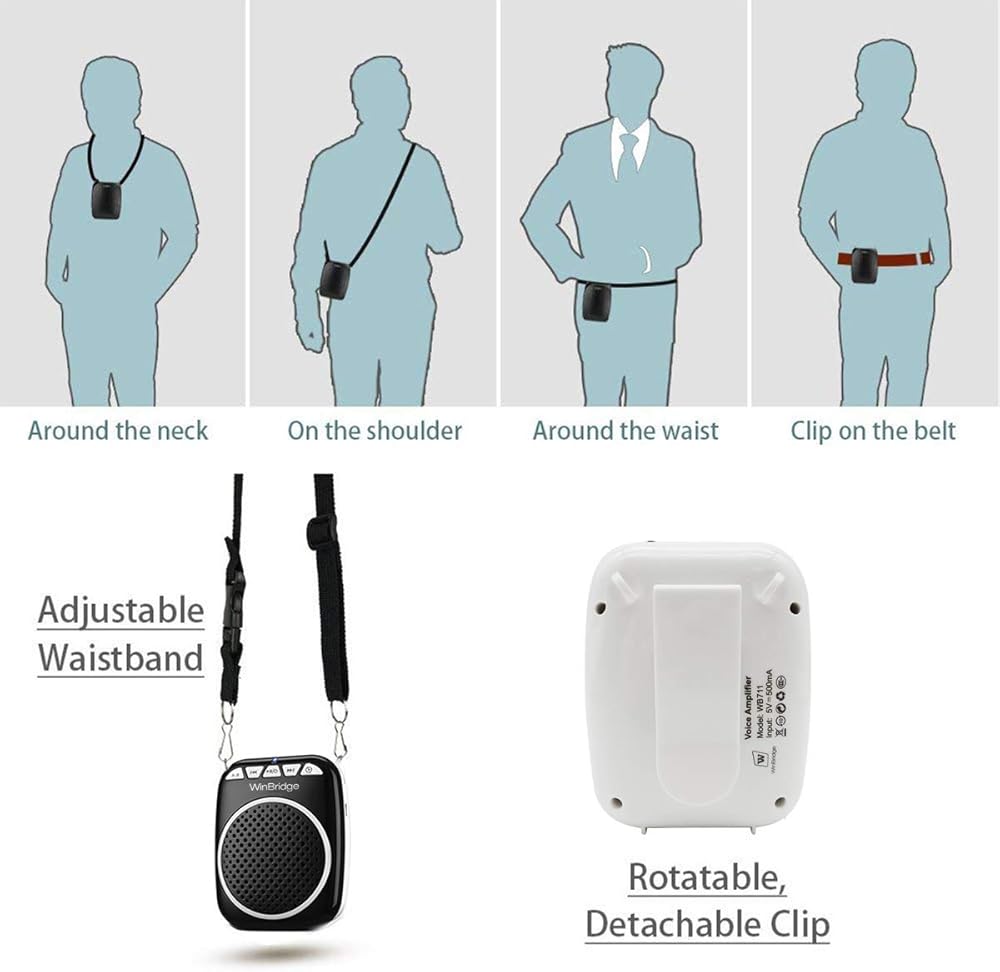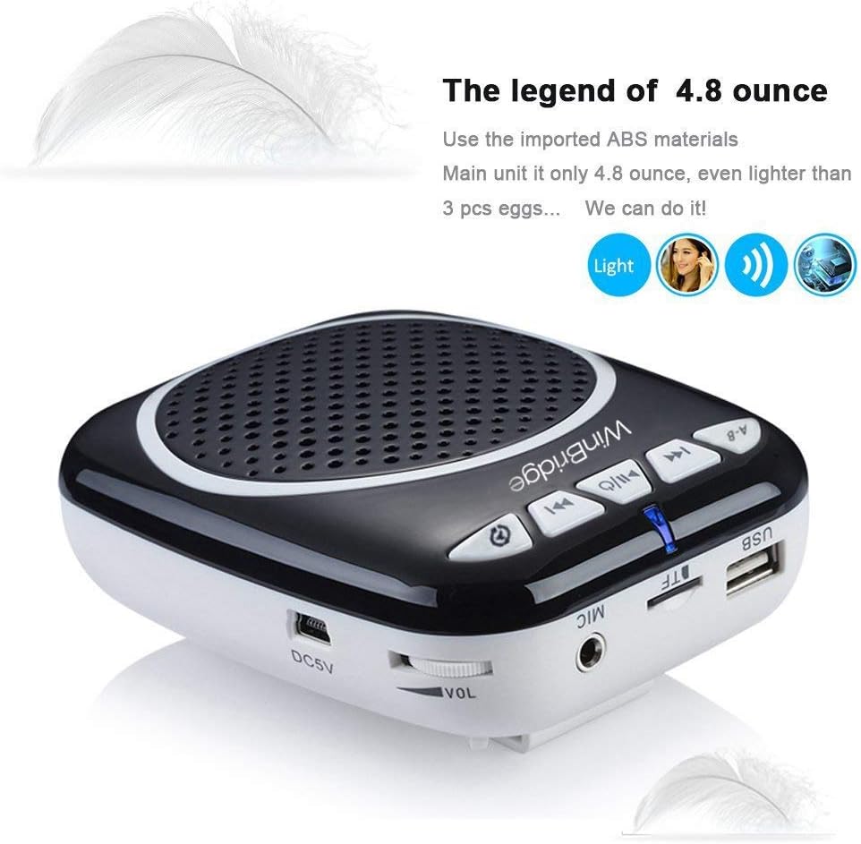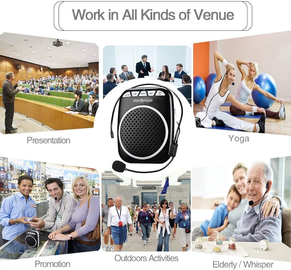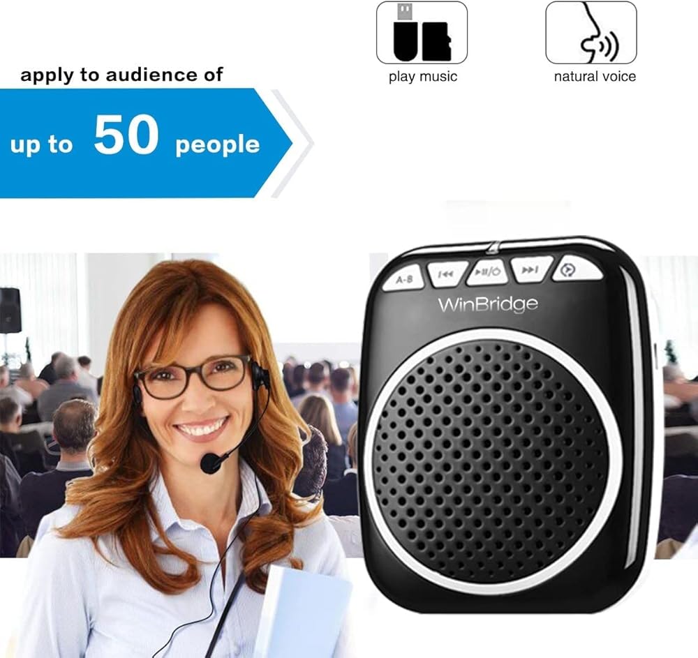 مضخم صوت فردي صغير ومخفض يعمل على تمديد الصوت في الغرفة. بغض النظر عن قدرته على تمديد صوت الميكروفون المحمول المدمج في هذا الجهاز. يمكن وضع سماعة الميكروفون مع مكبر الصوت بالقرب من الفم بفضل هيكلها المعقوف القابل للتخصيص. توضع سماعة الرأس فوق رأسك حتى تبقى ثابتة ولا تسقط. مكبر الصوت الفردي من وين بريدج هو جهاز صغير ساحر يجعل من السهل عليك إحضاره لك مع سماعة الرأس هذه وسيسمعك الجميع في الغرفة بصوت عالٍ وواضح. هذه الميكروفونات ومكبرات الصوت هي دليل استثنائي للمقدمات أو التجمعات المستمرة. تجمعات أصغر حيث يجب سماع الرواد، خاصة في المناسبة التي تواجه فيها صعوبة في صوتك. يمكن لمضخم الصوت المحمول أيضًا تشغيل الموسيقى من بطاقة تي اف ومحرك الميكا. يرفق حزام يمكن ربطه بمكبر الصوت باستخدام مثبتات ثم ارتداؤه حول الرقبة أو من خلال أحزمة الخصر. يمنحك العمل مع بطاريات ليثيوم بوليمر التي تعمل بالبطارية ما يصل إلى 5-8 ساعات من التكثيف المبتكر.